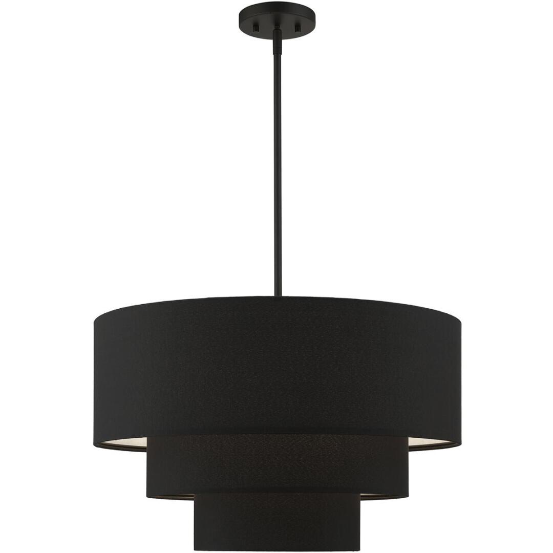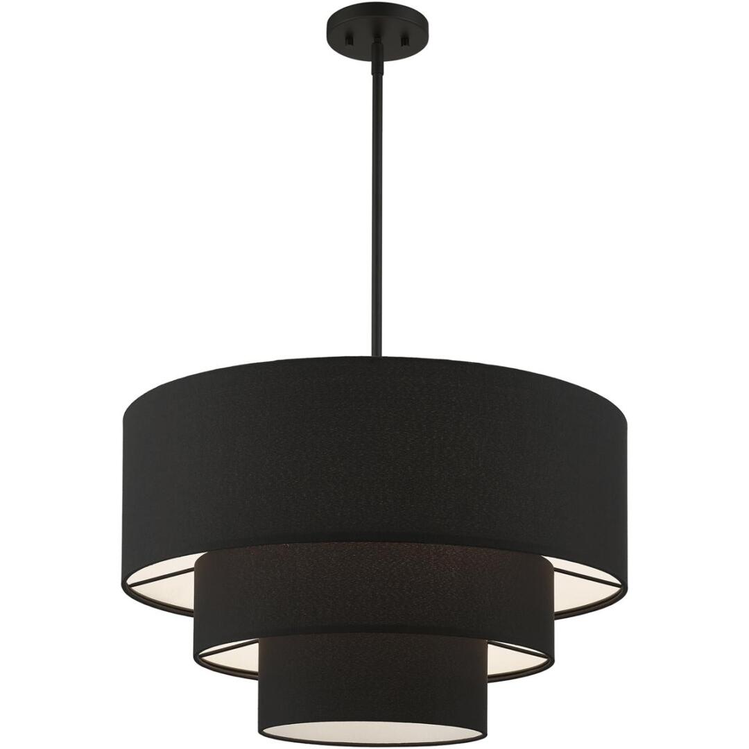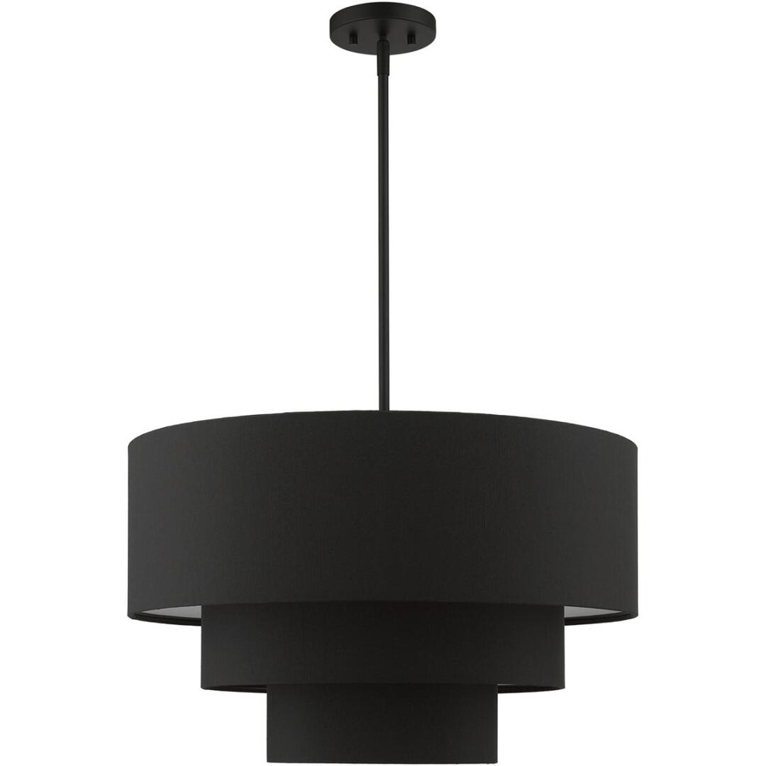 The four-light Bainbridge pendant chandelier is both modern and versatile. The hand-crafted black fabric hardback drum shades are set off by an inner silky white fabric that combines with a pendant-like black finish sweeping arm which creates a versatile effect. Perfect fit for the living room, dining room, kitchen and bedroom.
