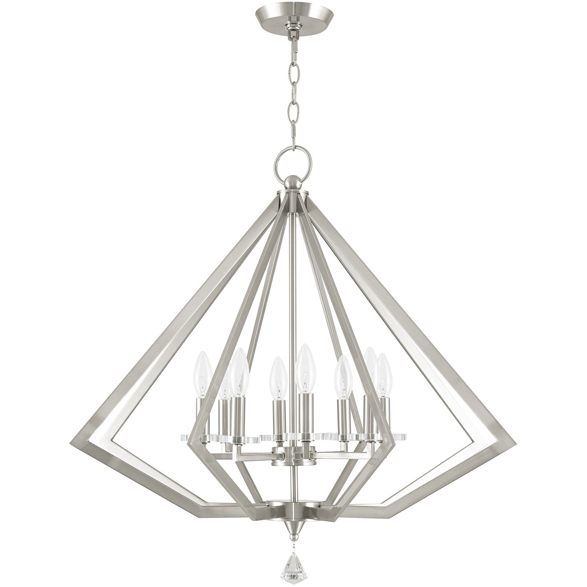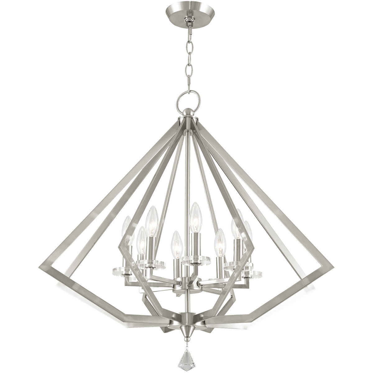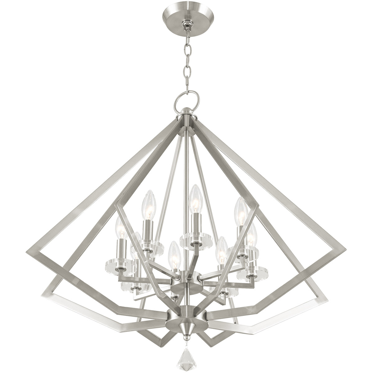 The Diamond eight light brushed nickel chandelier lets you explore a new facet of your design sense. Shaped like a diamond, this contemporary eight light chandelier is like jewelry for your home’s interior.
