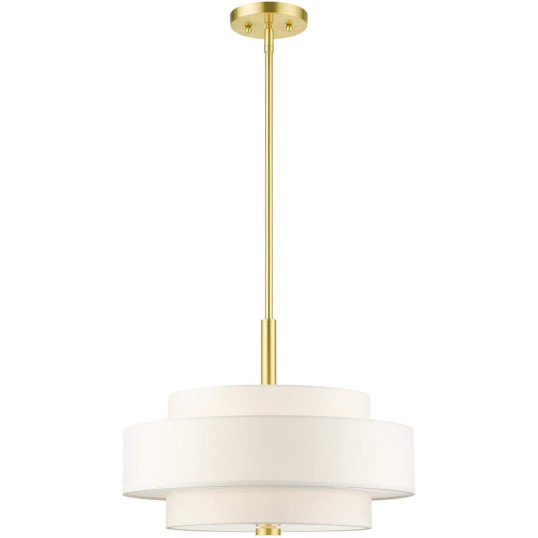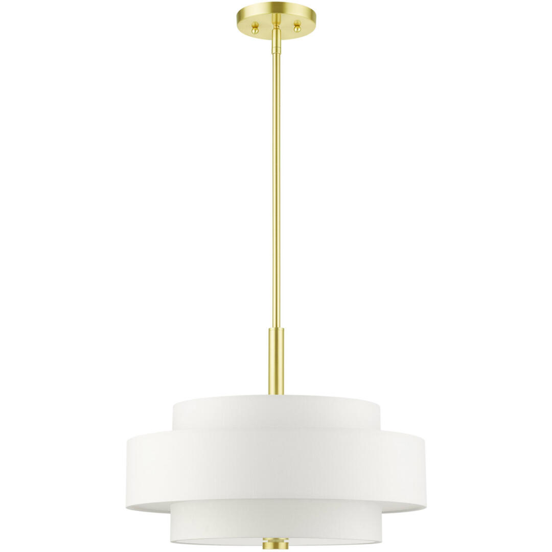 The Meridian collection has a clean, crisp look and contemporary appeal. The hand-crafted off-white fabric hardback shades offer a diffused warm light. This four-light multi-tier drum shade adds character to this handsomely styled pendant chandelier. Will adapt well in the living room, dining room or in the bedroom tastefully elevating your style. This sleek design is shown in a satin brass finish.