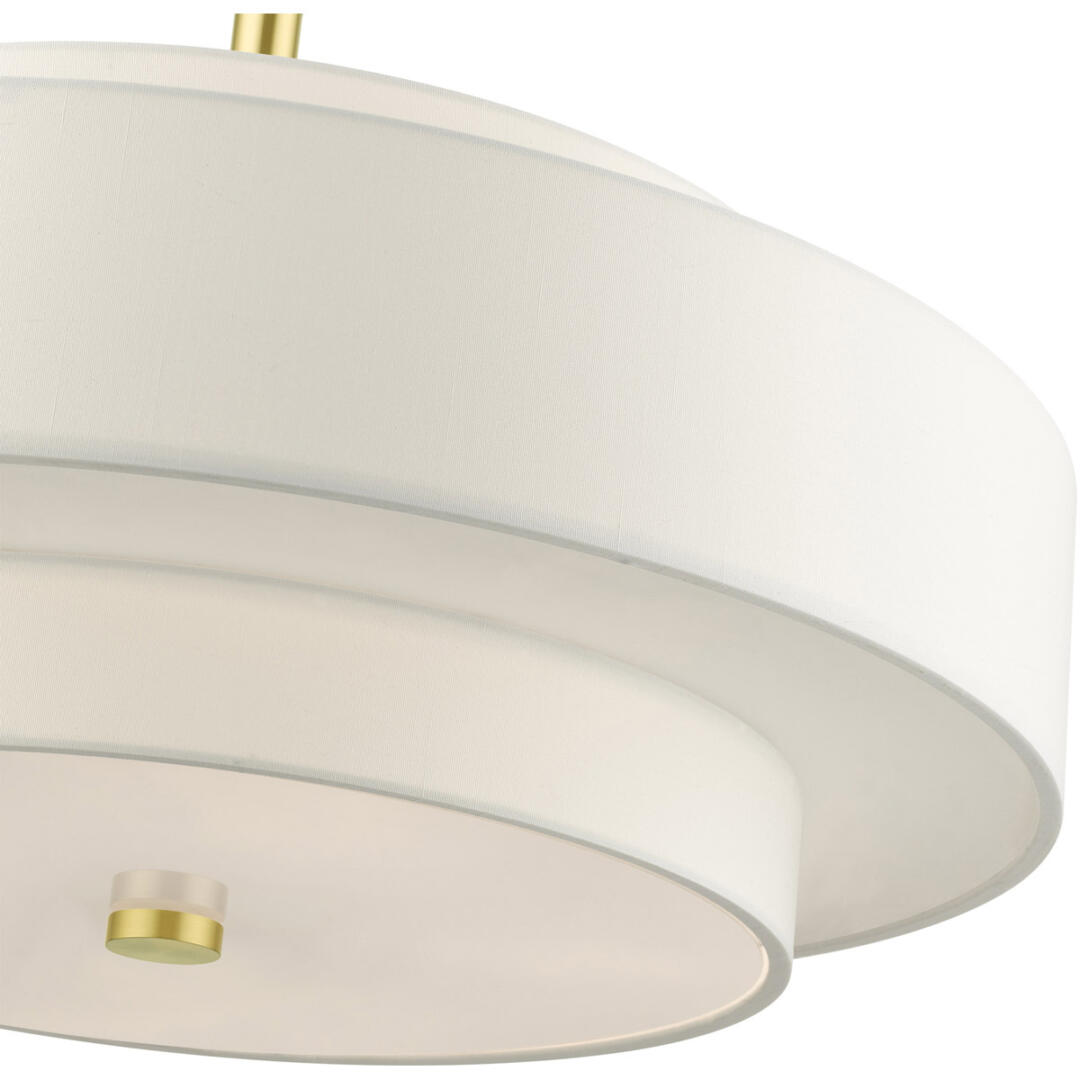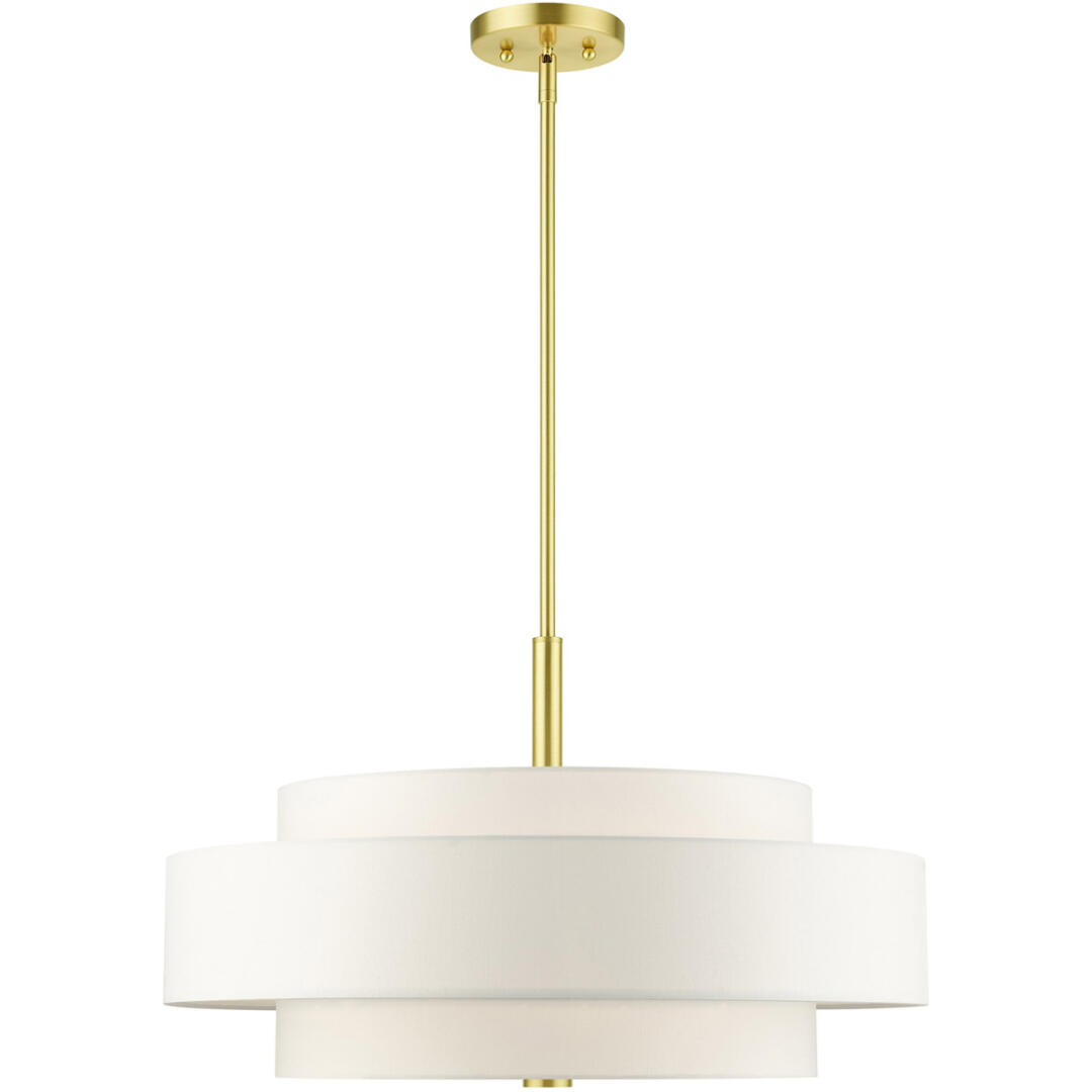 The Meridian collection has a clean, crisp look and contemporary appeal. The hand-crafted off-white fabric hardback shades offer a diffused warm light. This five-light multi-tier drum shade adds character to this handsomely styled pendant chandelier. Will adapt well in the living room, dining room or in the bedroom tastefully elevating your style. This sleek design is shown in a satin brass finish.