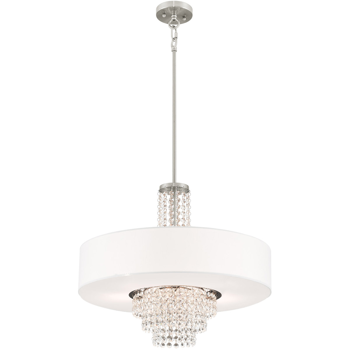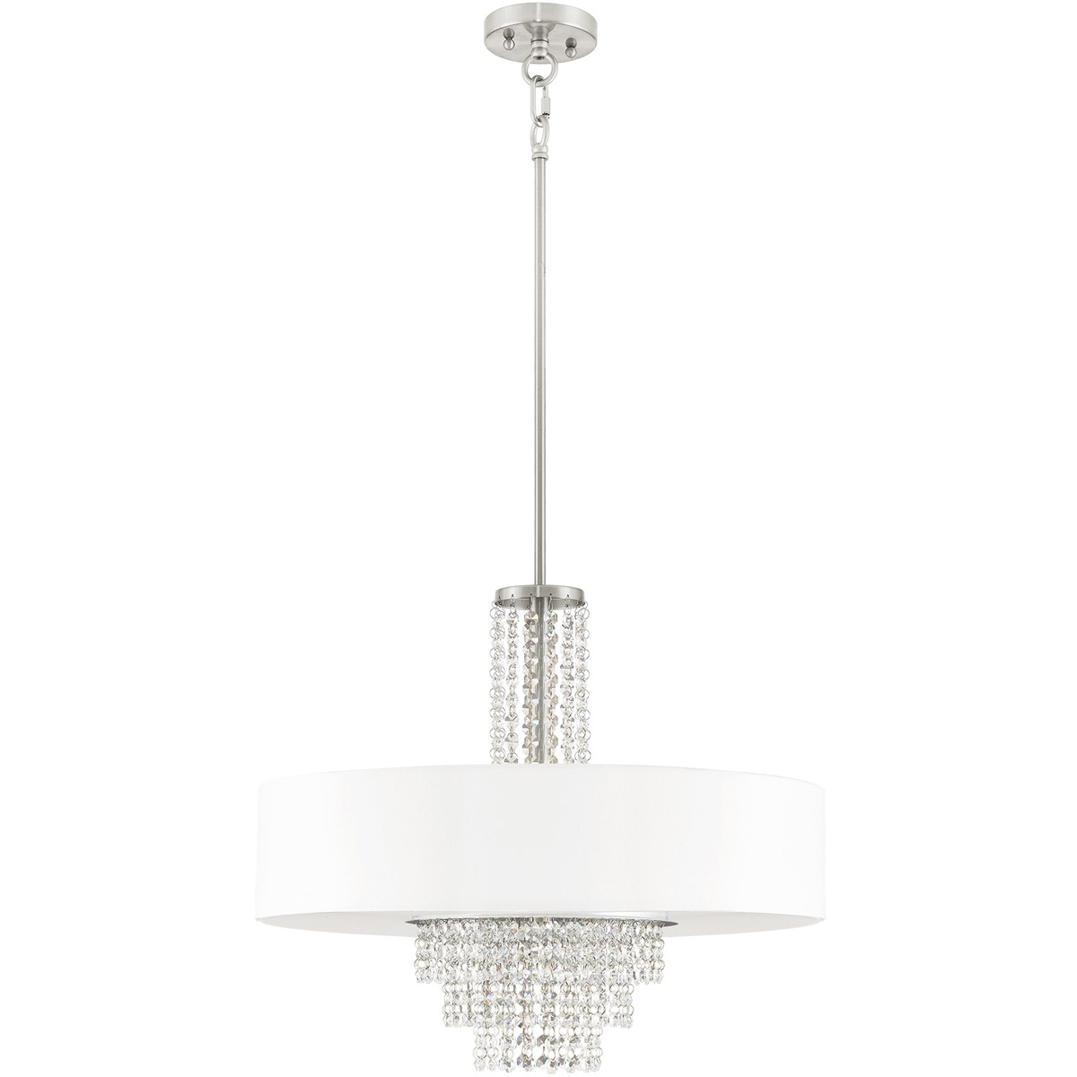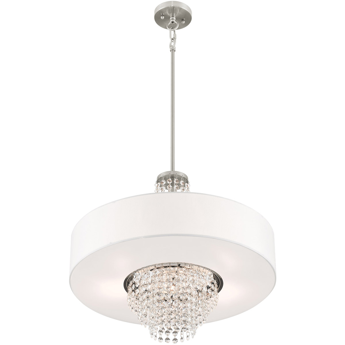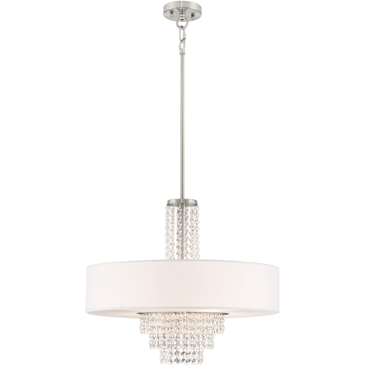 A contemporary style pendant from the Carlisle collection. The design features a brushed nickel housing and canopy, with hanging strands of beautiful clear crystal. A hand crafted off white fabric hardback drum shade surrounds the crystals and fixture frame, and creates a magnificently sophisticated look.