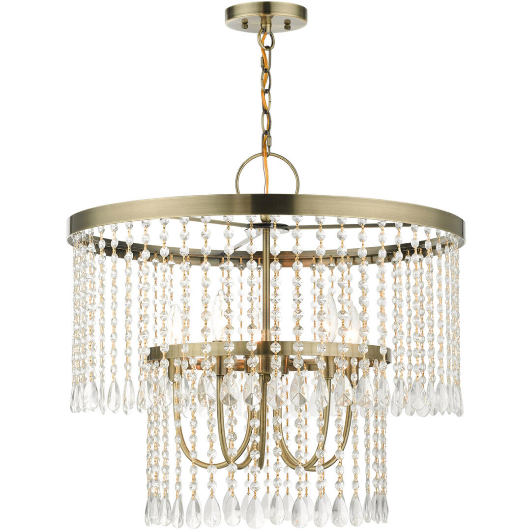 Decorative finishes complete the beautiful Elizabeth series with a refined quality. Clear crystal frills offer detailed elegance to the design of this five-light antique brass pendant chandelier. Attract attention with the bold personality provided by this lovely fixture which is perfect for your living room, dining room or bedroom.