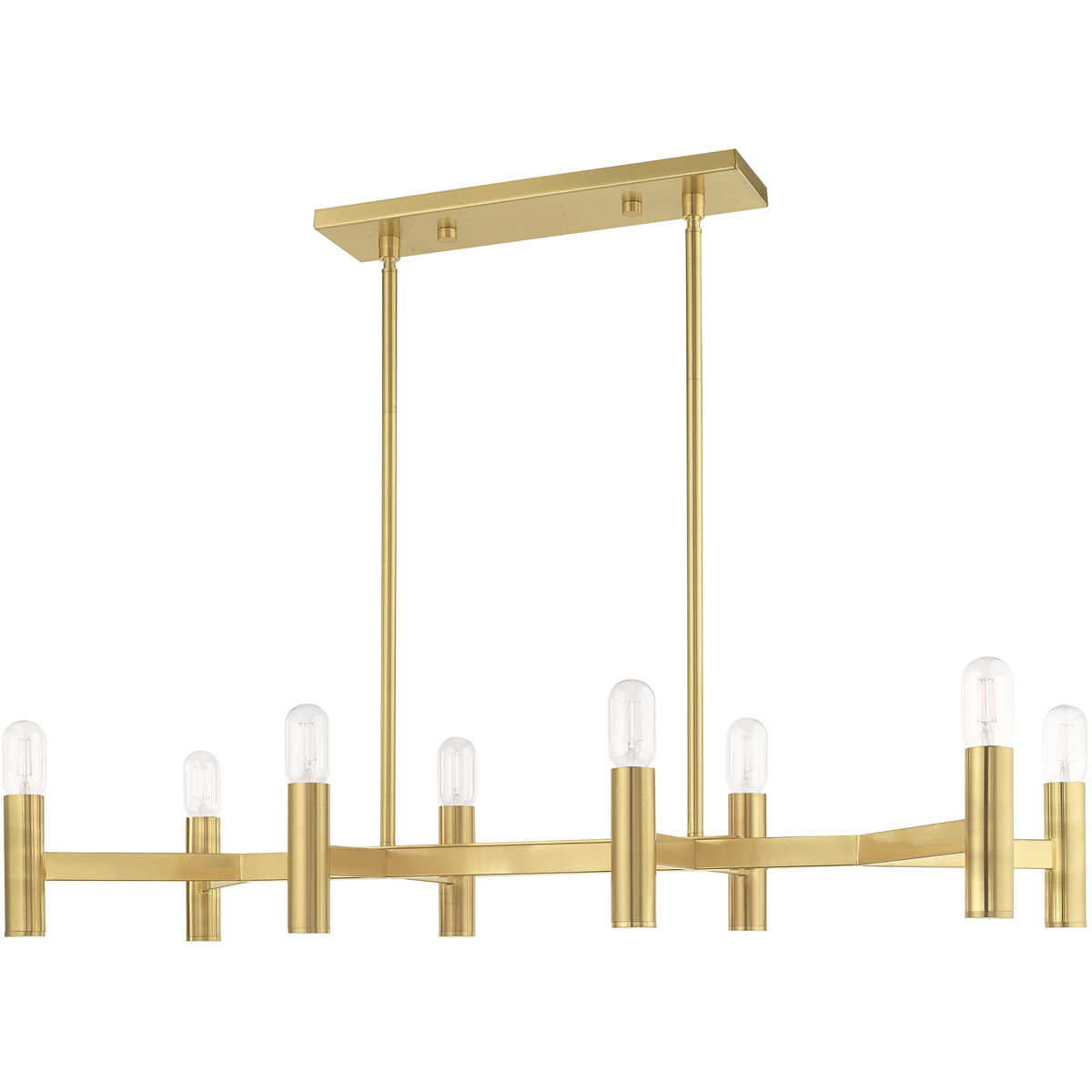 Exposed bulb sockets are fixed over satin brass to create an eclectic look perfect for mid century modern or transitional spaces wanting an industrial touch.