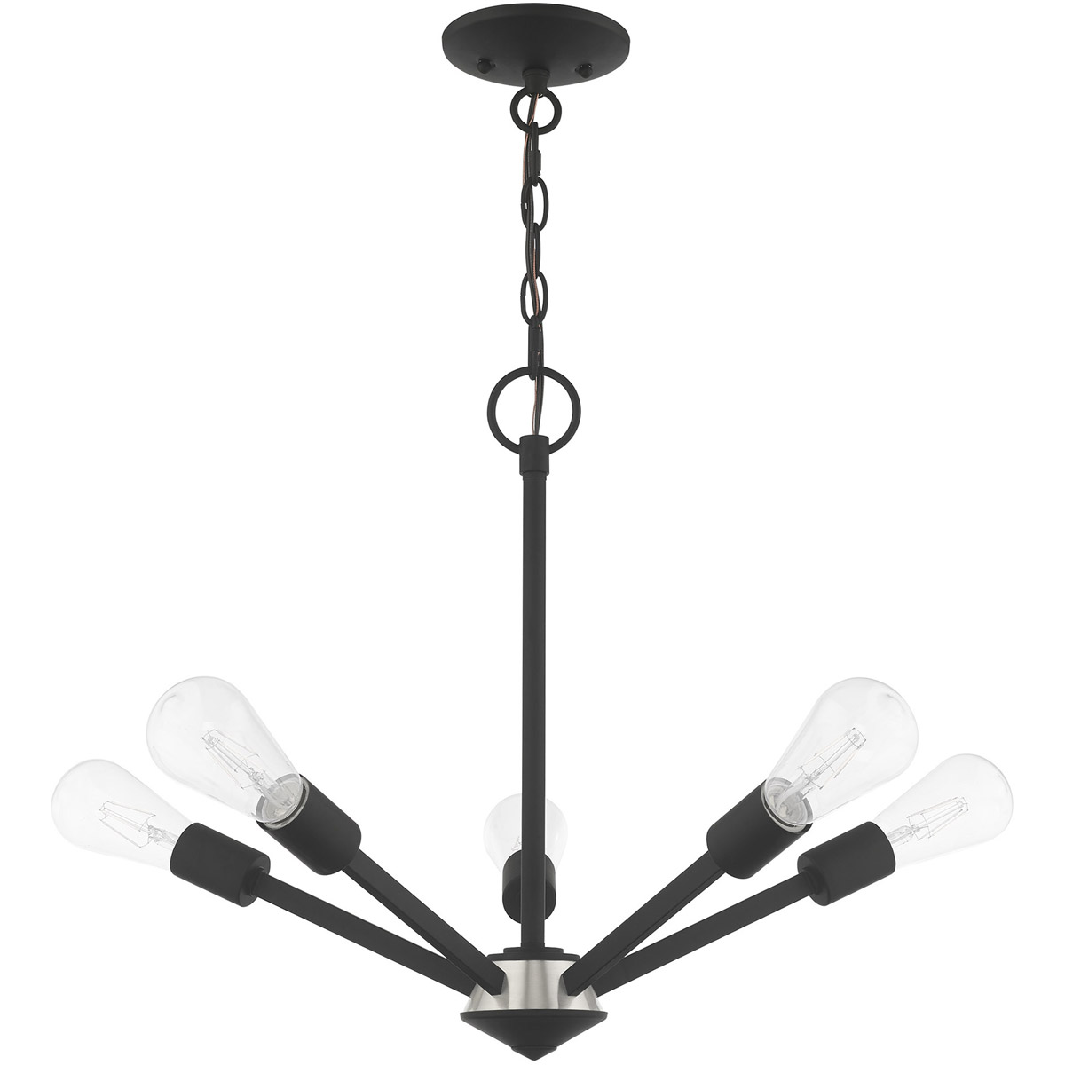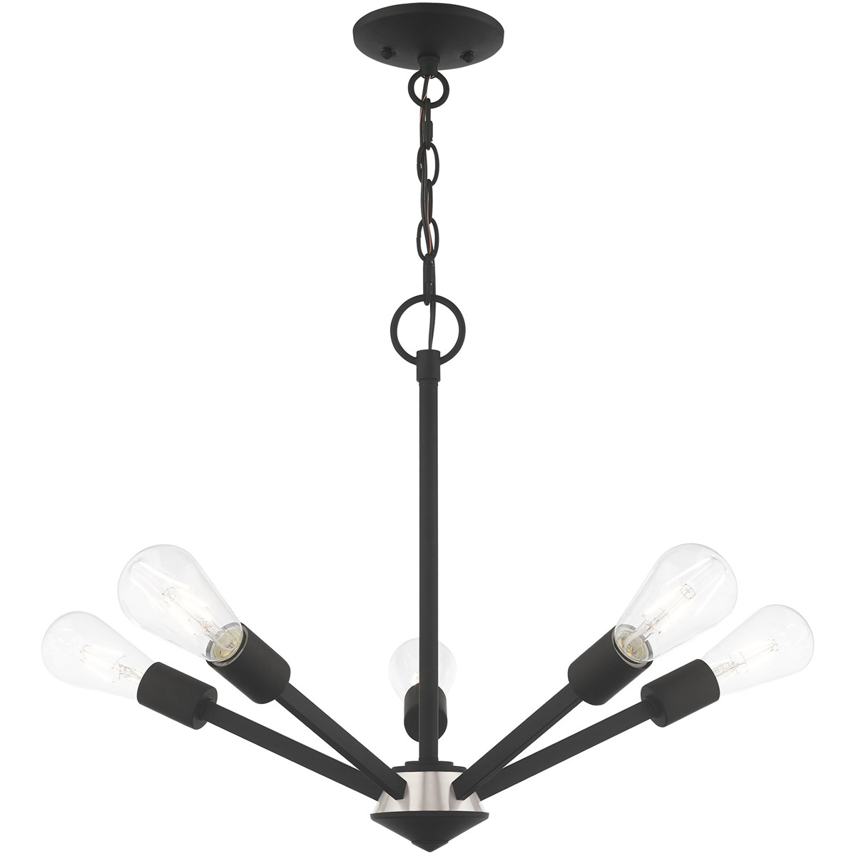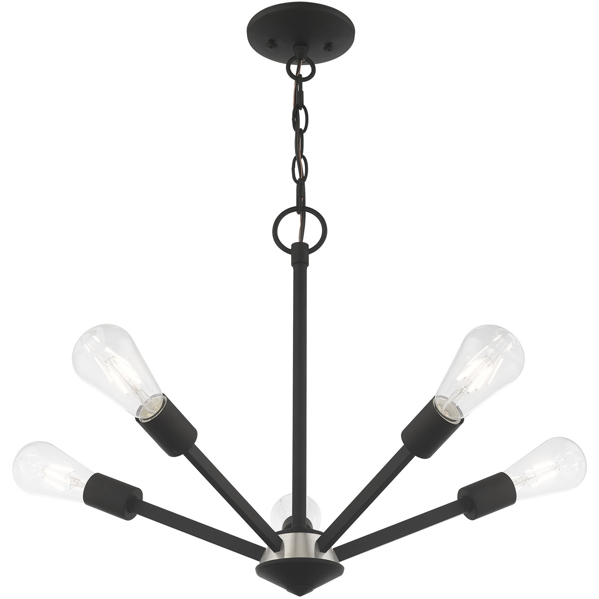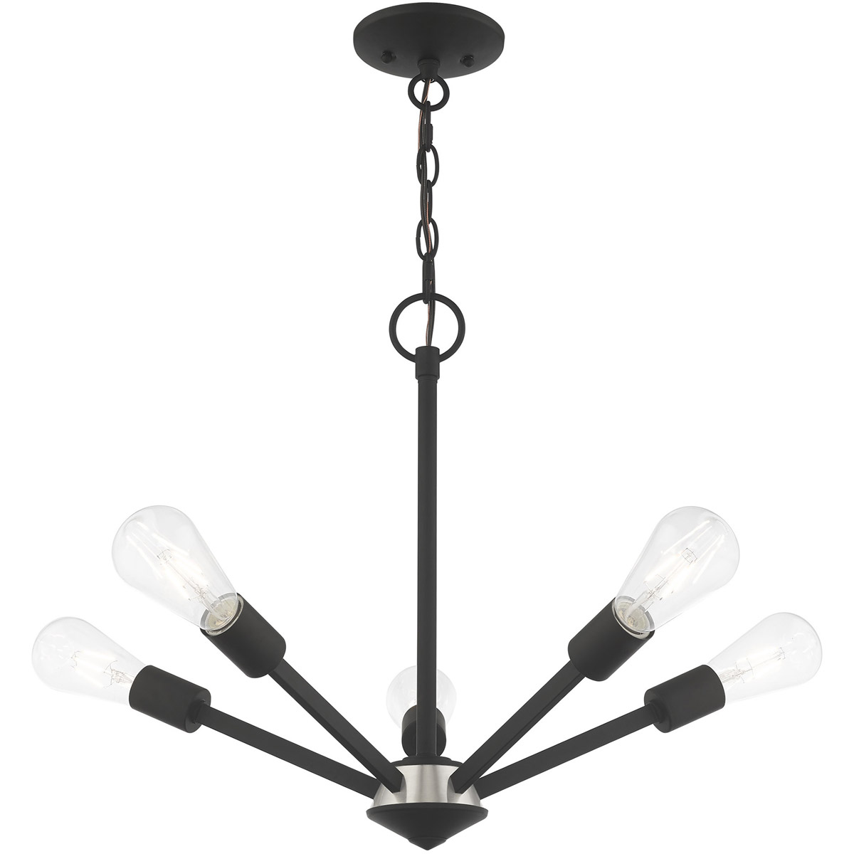 Add eye-catching lighting to your home decorating with the lively look of the Prague chandelier in black finish with a brushed nickel finish accent. This five-light design features vintage style Edison bulbs that up the style factor, giving it an attractive, mid-century modern and industrial edge.