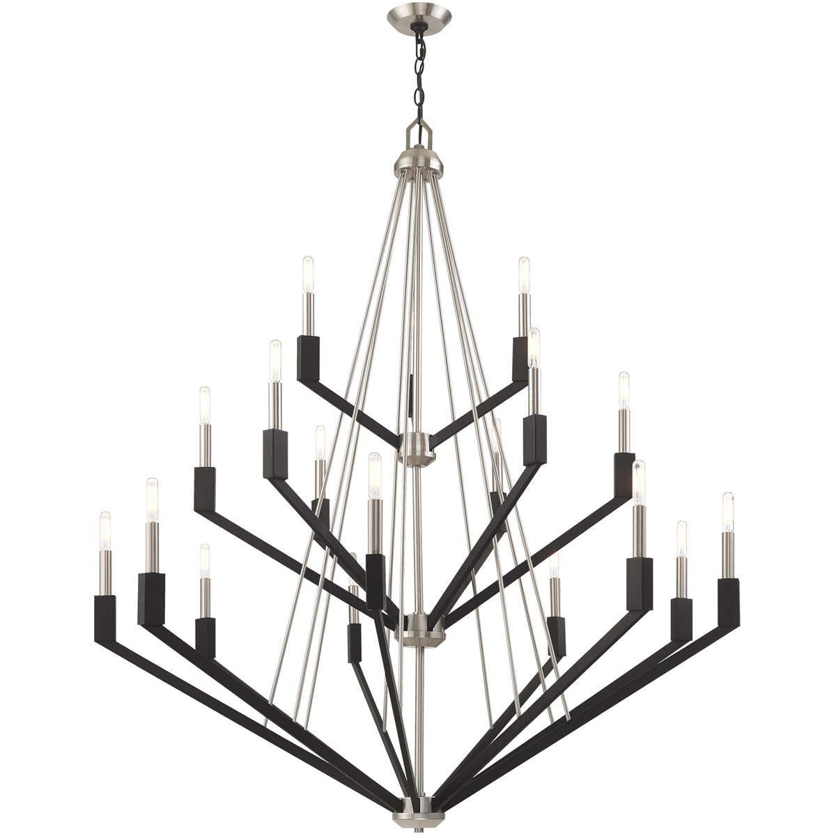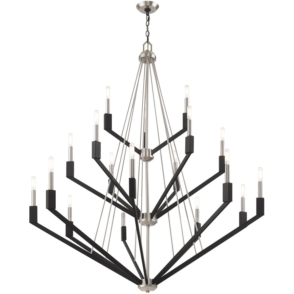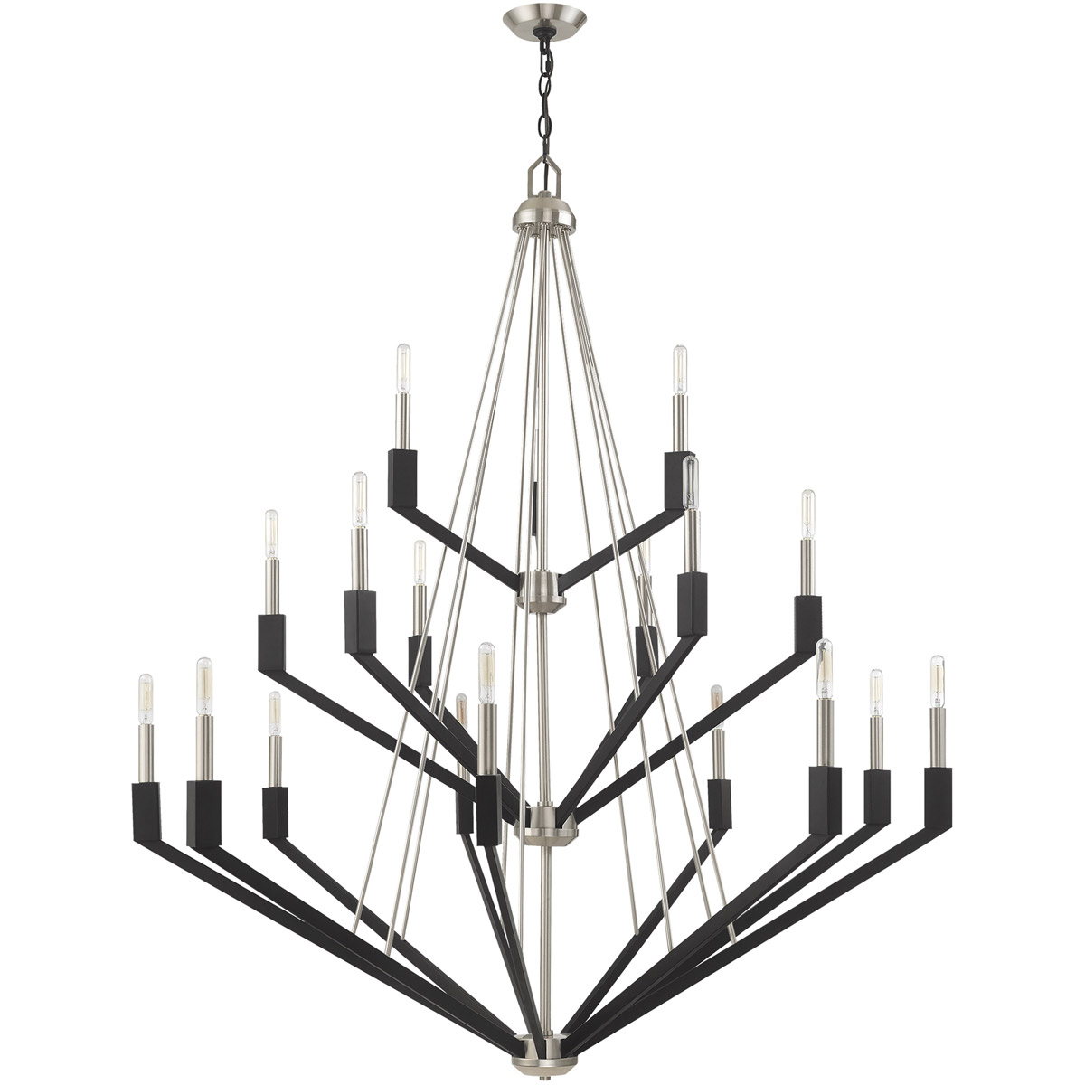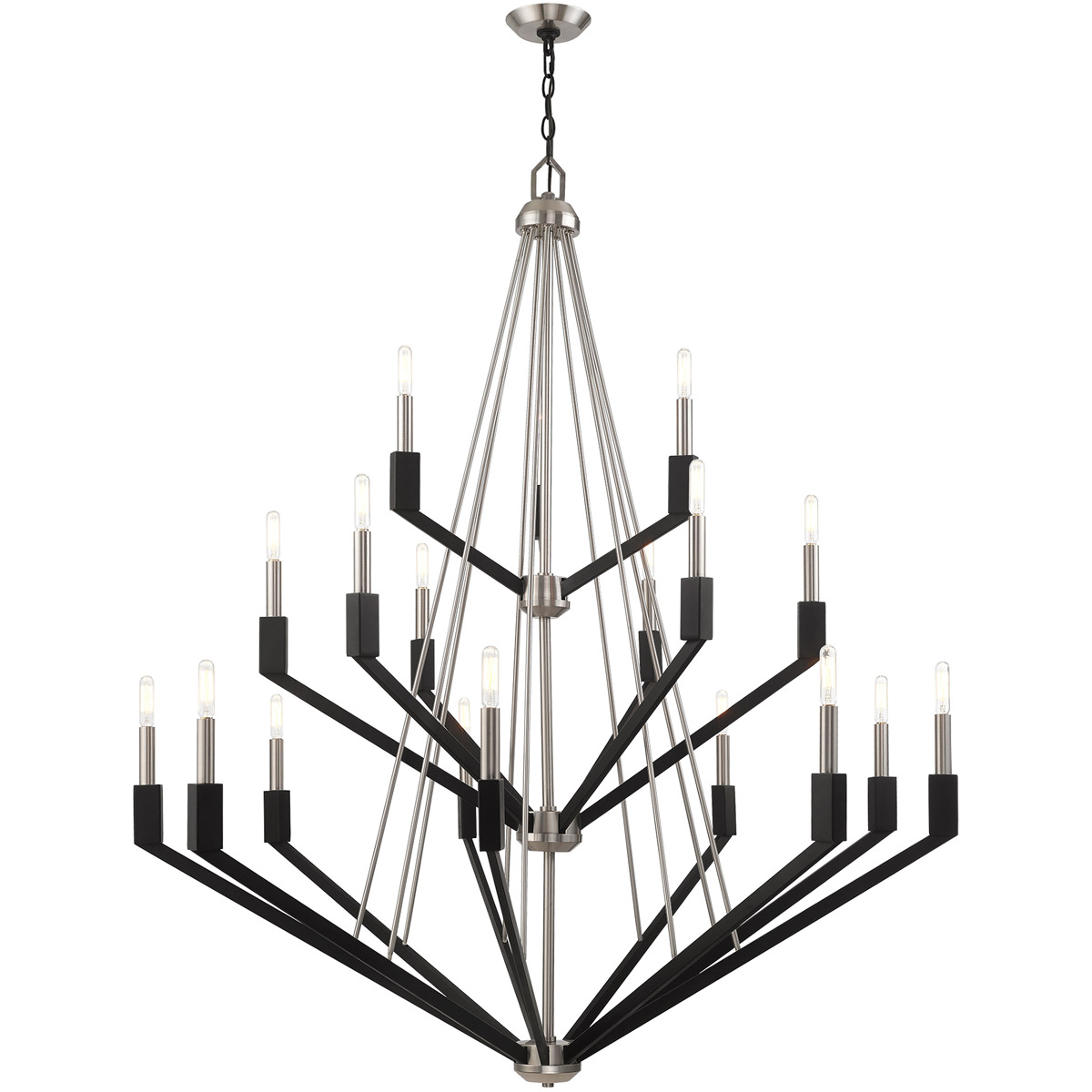 Illuminate your home with bright designs from the Beckett collection. The eighteen light foyer chandelier emulates a mid-century modern style made popular in the 50s and 60s. The brushed nickel frame is accented with black accents, helping to fully complete this look.