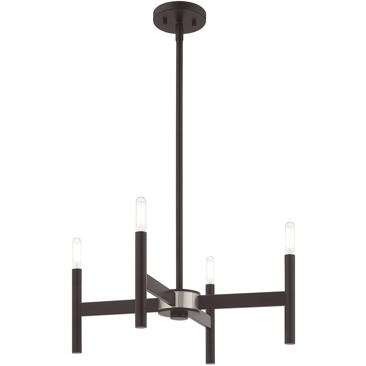 Exposed bulb sockets are fixed over a bronze finish with brushed nickel accent to create an eclectic look perfect for mid century modern or transitional spaces wanting an industrial touch.