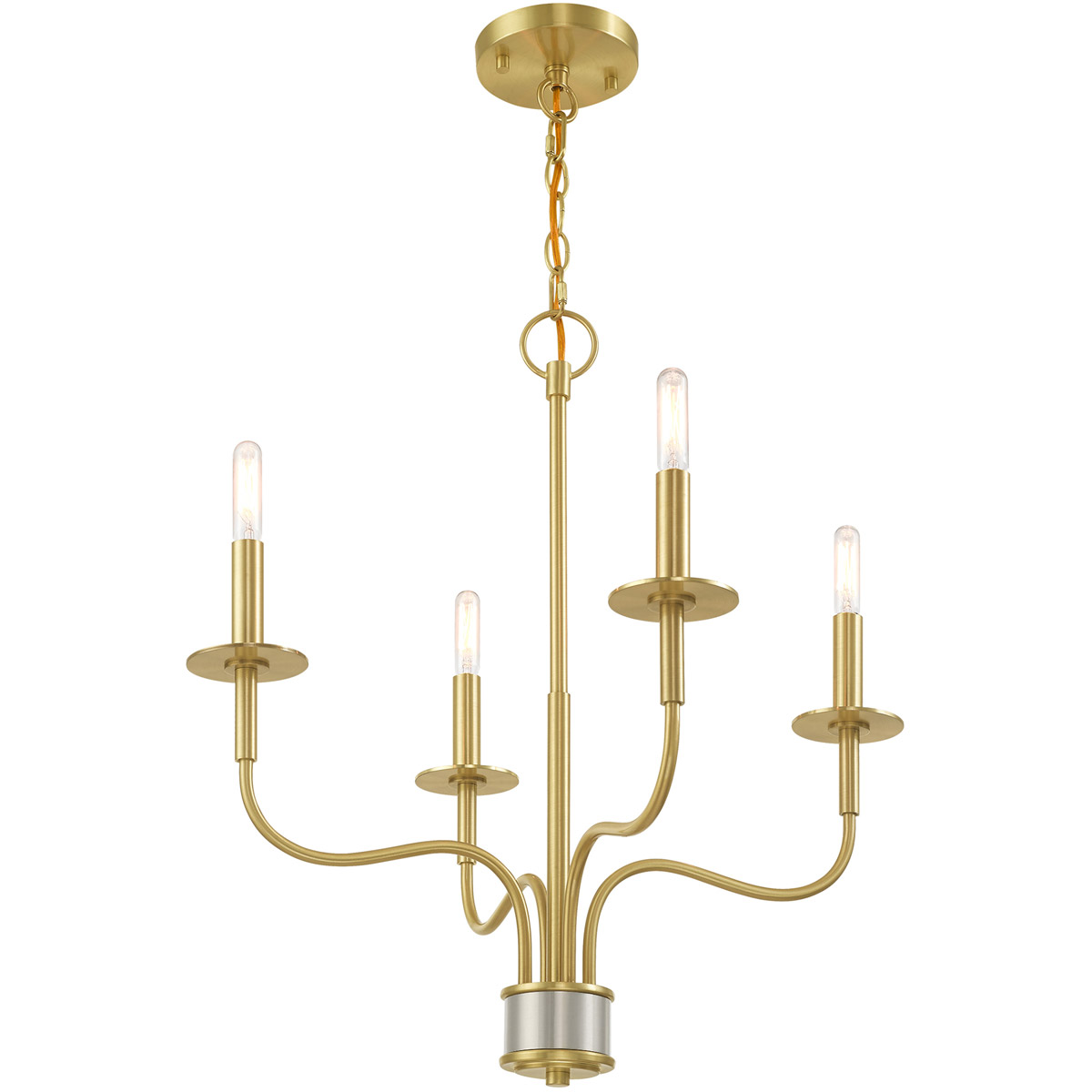 This minimalist four light mini chandelier has transitional and traditional appeal. The satin brass finish with brushed nickel accents and simple style take this piece from classic to modern and industrial spaces.