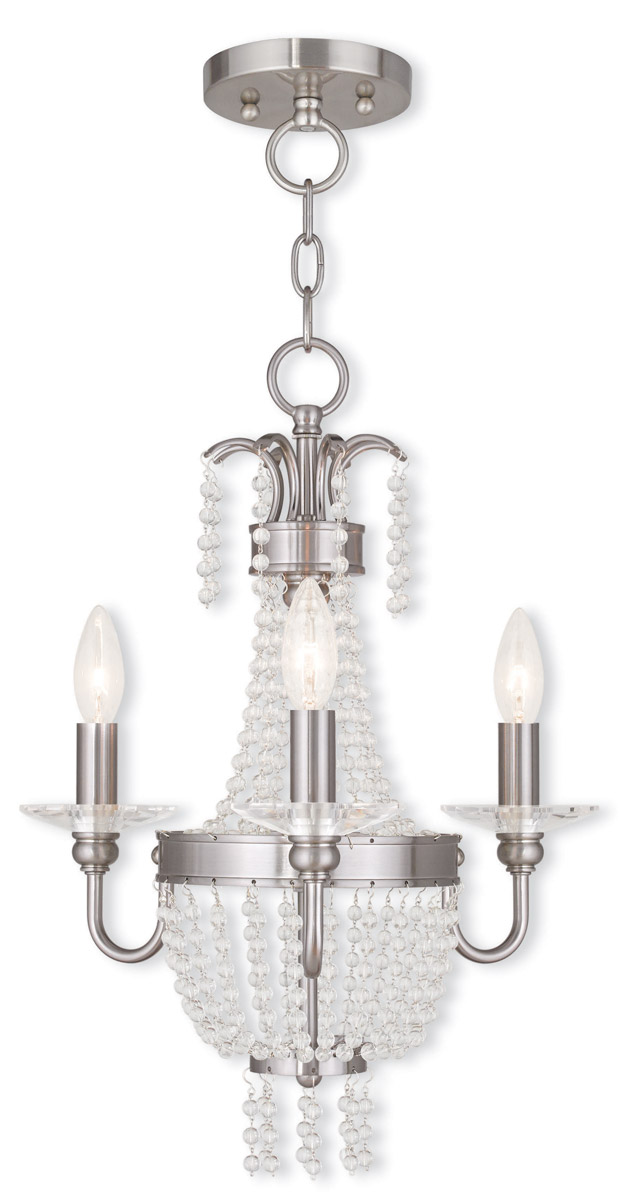 A beautiful cascade of clear crystal beads creates a striking effect of refracted light. This three light mini chandelier is finished in a brushed nickel finish mixing traditional refinement with modern style. Place this crystal mini chandelier in both contemporary and time-honored spaces for the perfect look