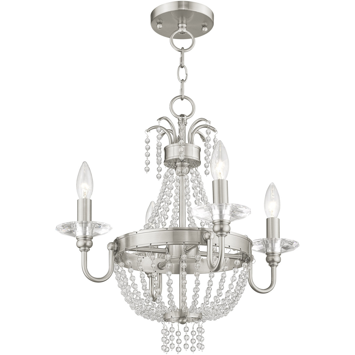 A beautiful cascade of clear crystal beads creates a striking effect of refracted light. This four light mini chandelier is finished in a brushed nickel finish mixing traditional refinement with modern style. Place this crystal mini chandelier in both contemporary and time-honored spaces for the perfect look