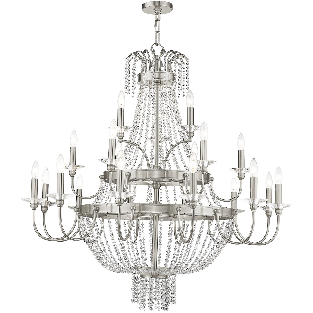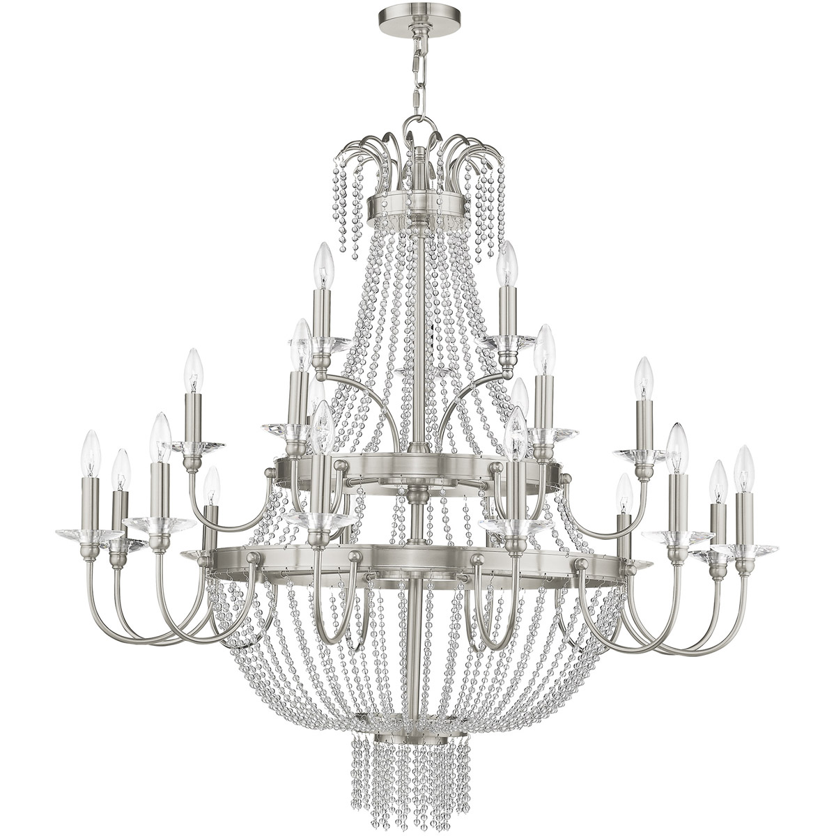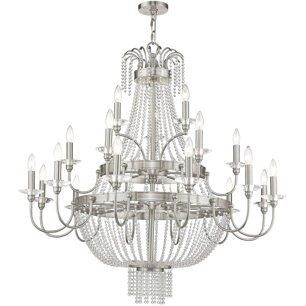A beautiful cascade of clear crystal beads creates a striking effect of refracted light. This twenty one light foyer chandelier is finished in a brushed nickel finish mixing traditional refinement with modern style. Place this crystal foyer chandelier in both contemporary and time-honored spaces for the perfect look.