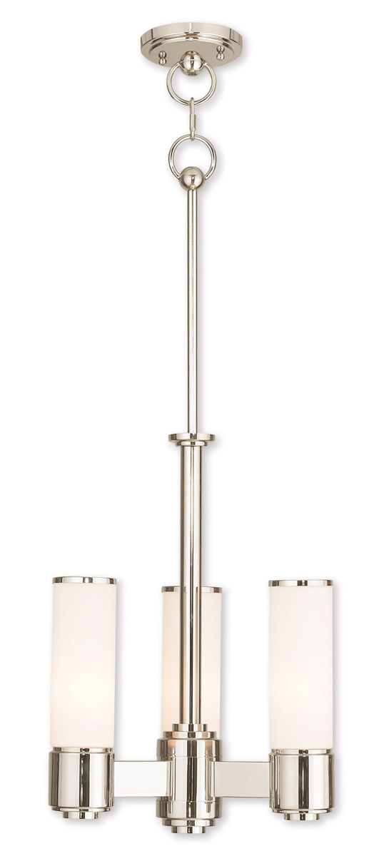 This stunning design features a polished nickel finish studded with hand blown satin opal white glass. This sleek design is perfect for powder rooms, master bathrooms or you can even put a couple of these over your kitchen island.