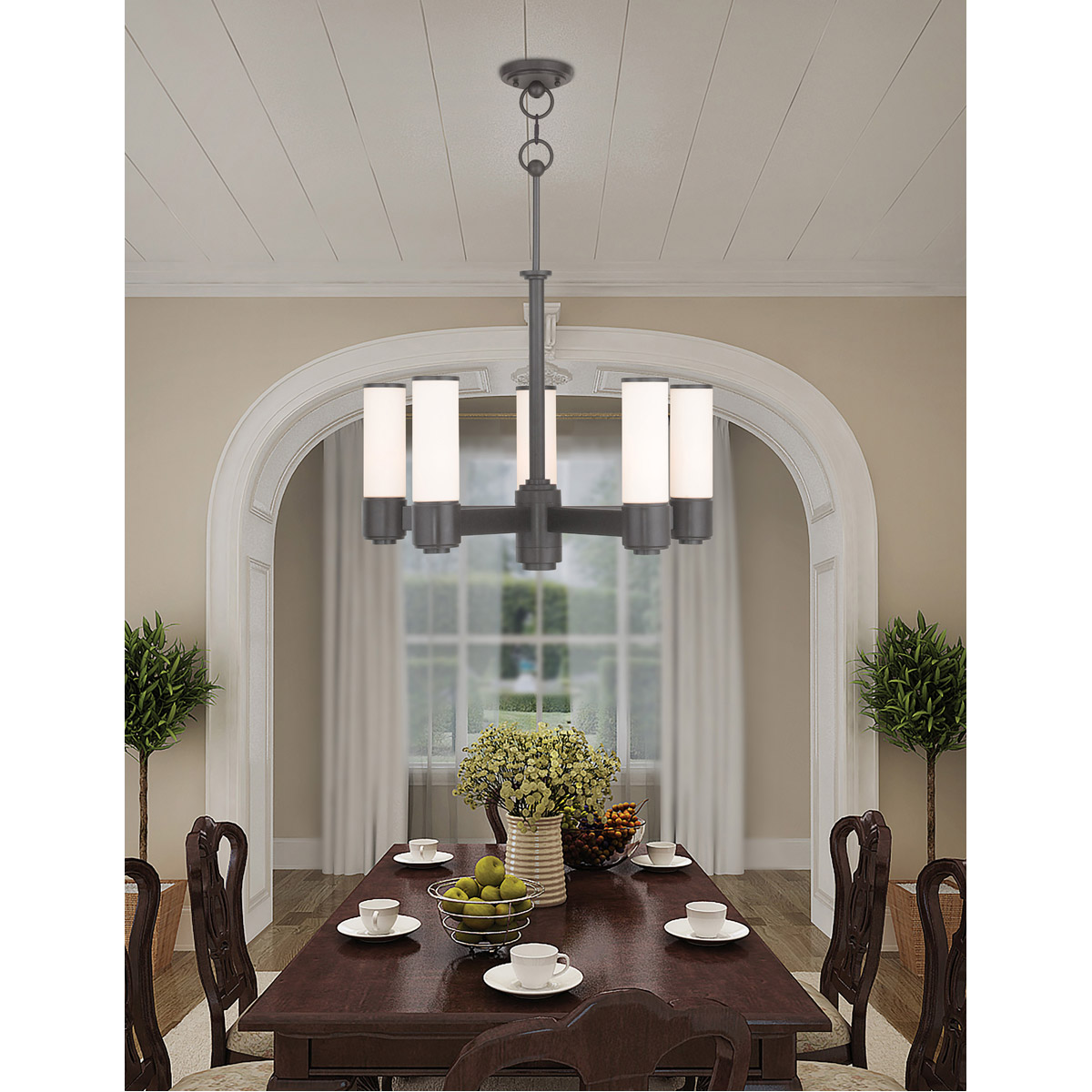 This stunning design features a English bronze finish studded with hand blown satin opal white glass and a integrated LED downlight. This sleek design will brighten up entryways, living spaces and dining areas.