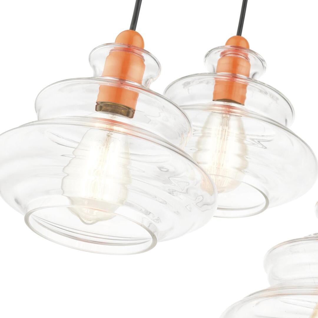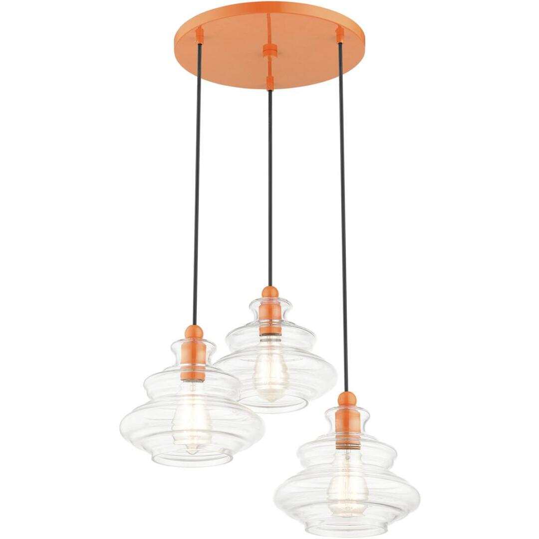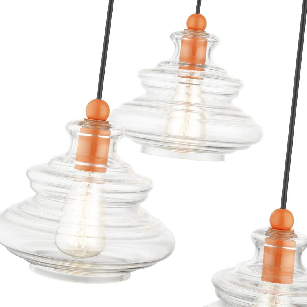 The Everett three light pendant chandelier suspends simply and will adapt well over a kitchen countertop, in the living room, foyer or a dining room. It is shown in a shiny orange finish and hand blown clear art glass.