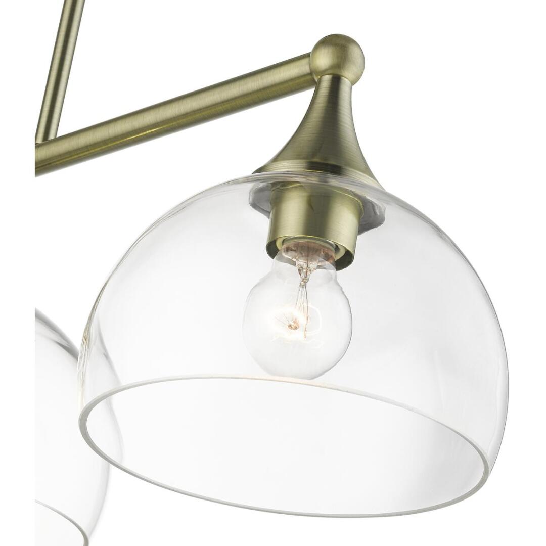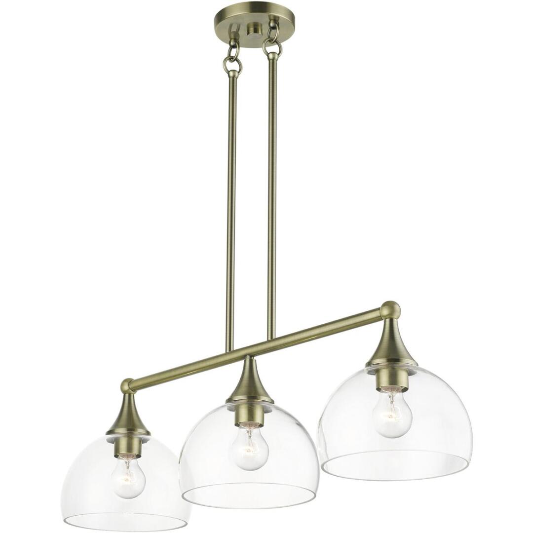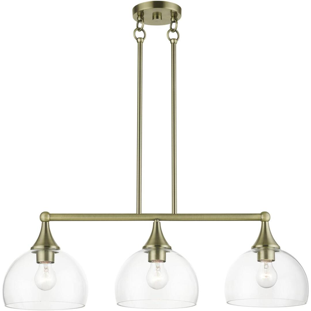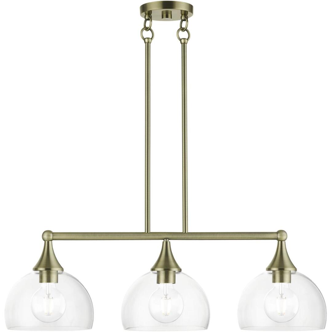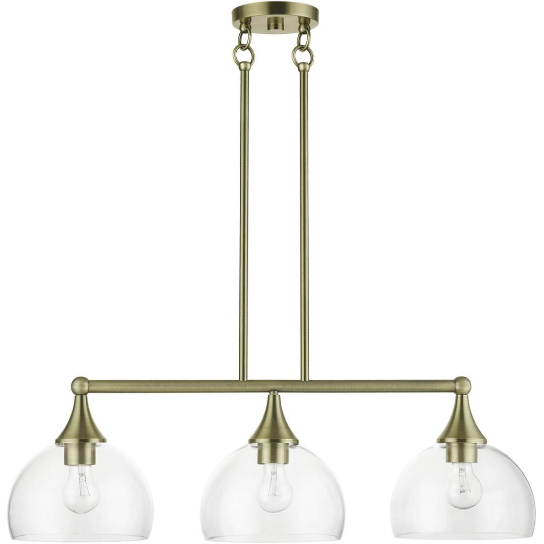 This three light linear chandelier from the Glendon collection has understated elegance. It features minimal details, clear curved glass with an antique brass finish and can fit into any decor.