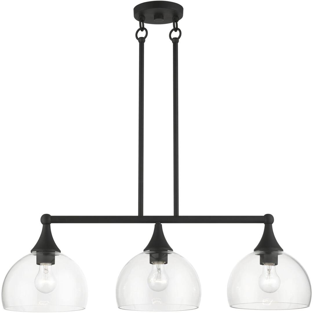This three light linear chandelier from the Glendon collection has understated elegance. It features minimal details, clear curved glass with a black finish and can fit into any decor.