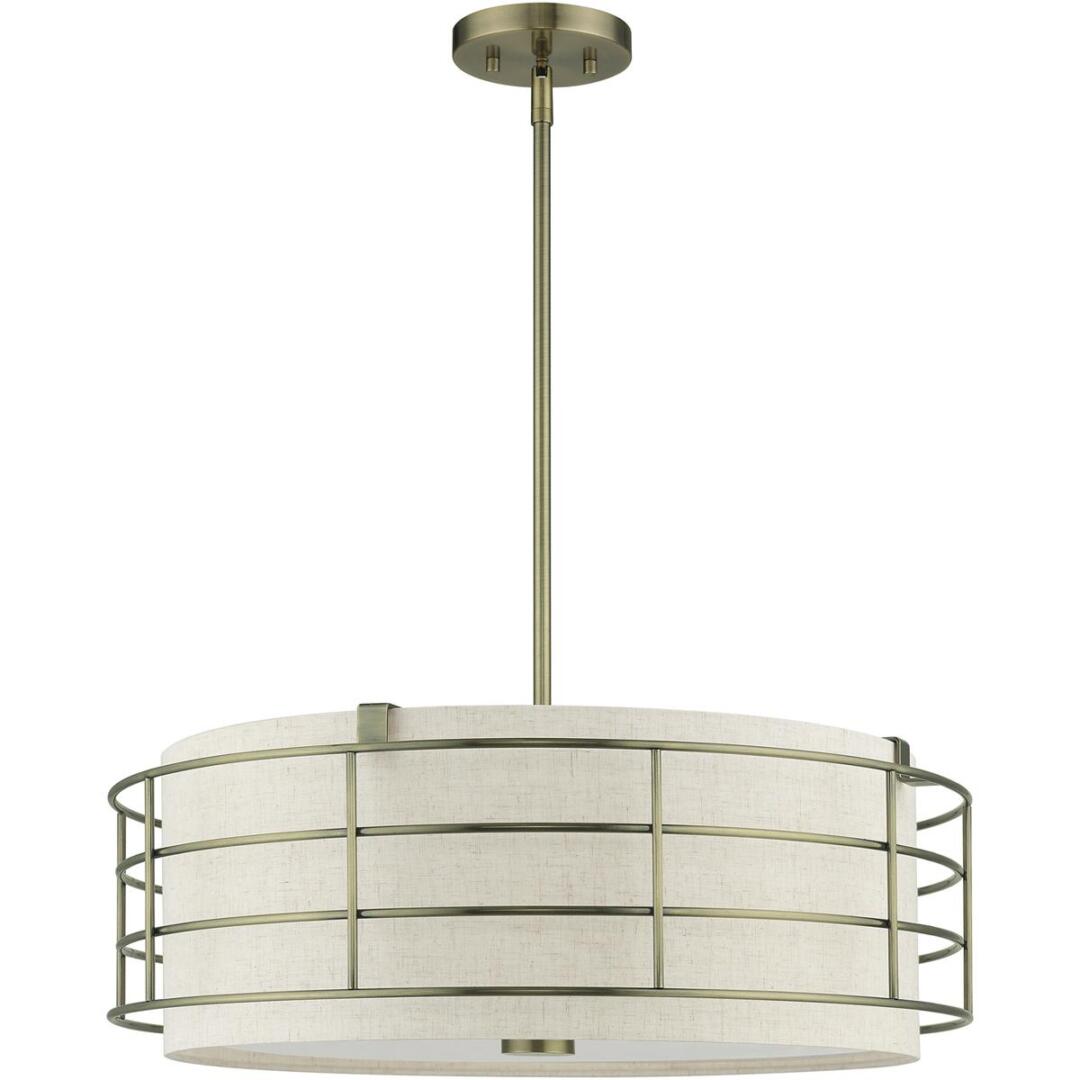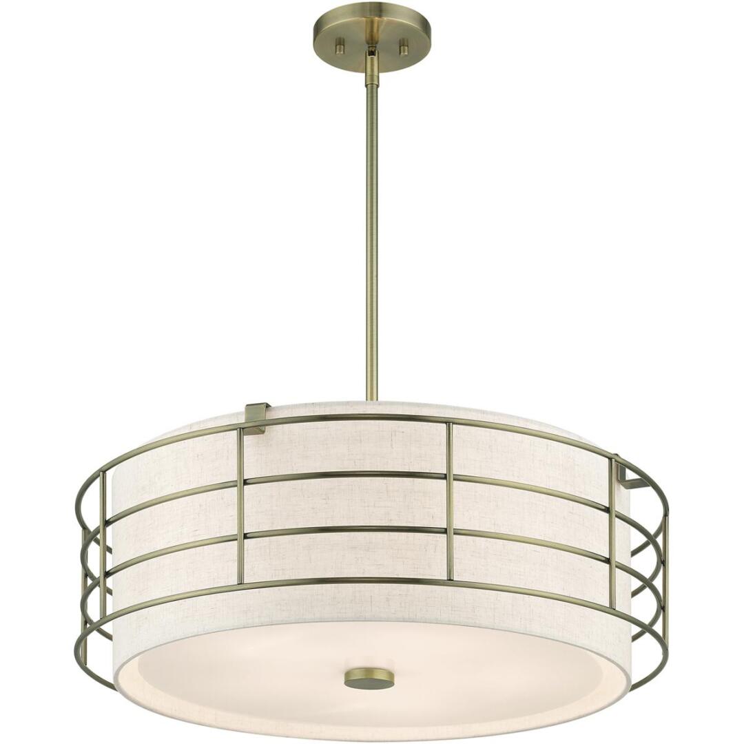 The Blanchard pendant chandelier adds refined style and a hint of mystery to your décor. The antique brass finish and an oatmeal handcrafted hardback shade create warm illumination, while soft light brings to life the intricate fretwork pattern. This five-light drum pendant chandelier will add a sophisticated and glamorous look to almost any interior design style. It will work great in the living room, over the dining table or the bedroom.