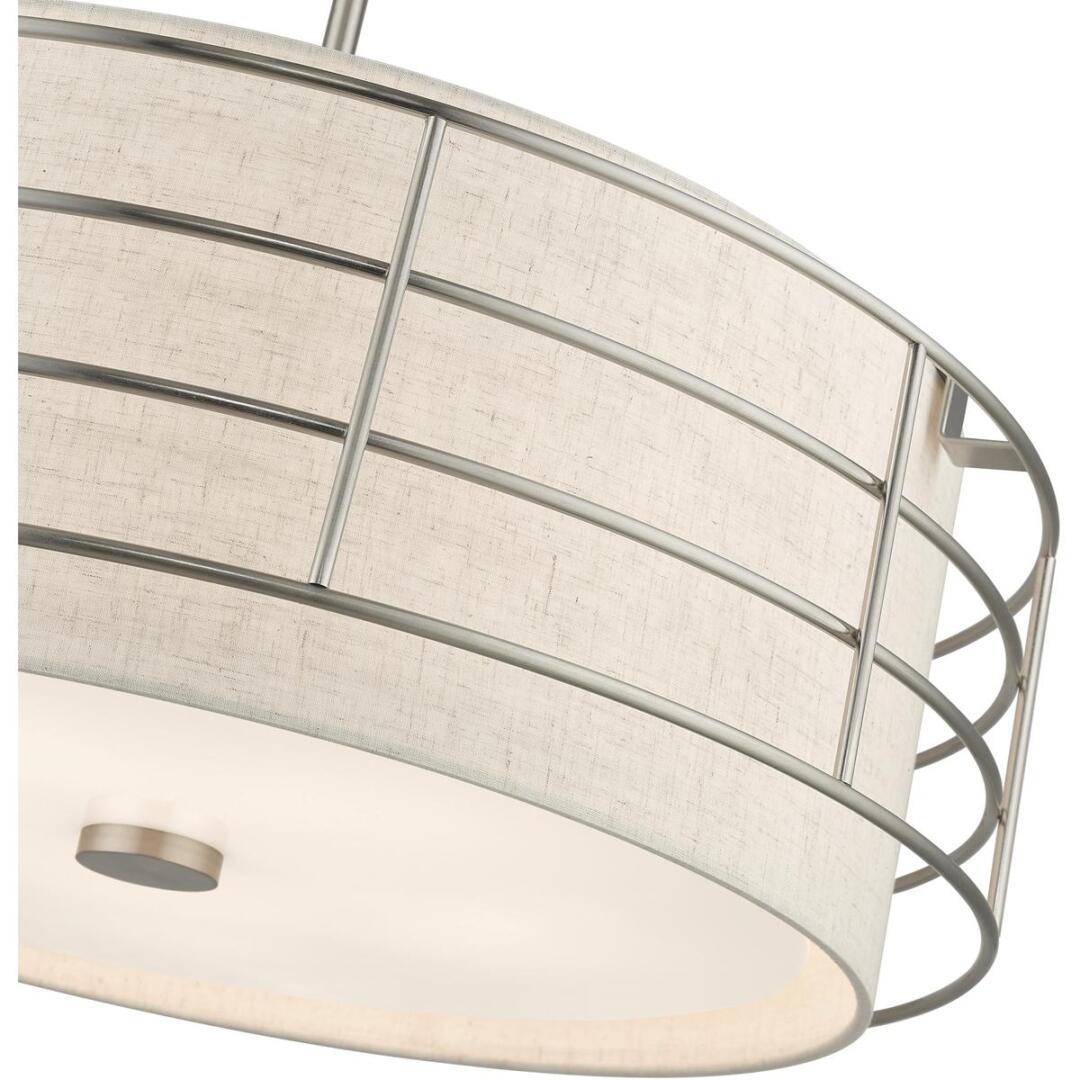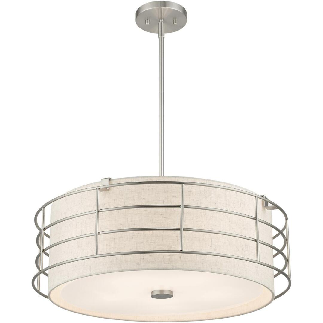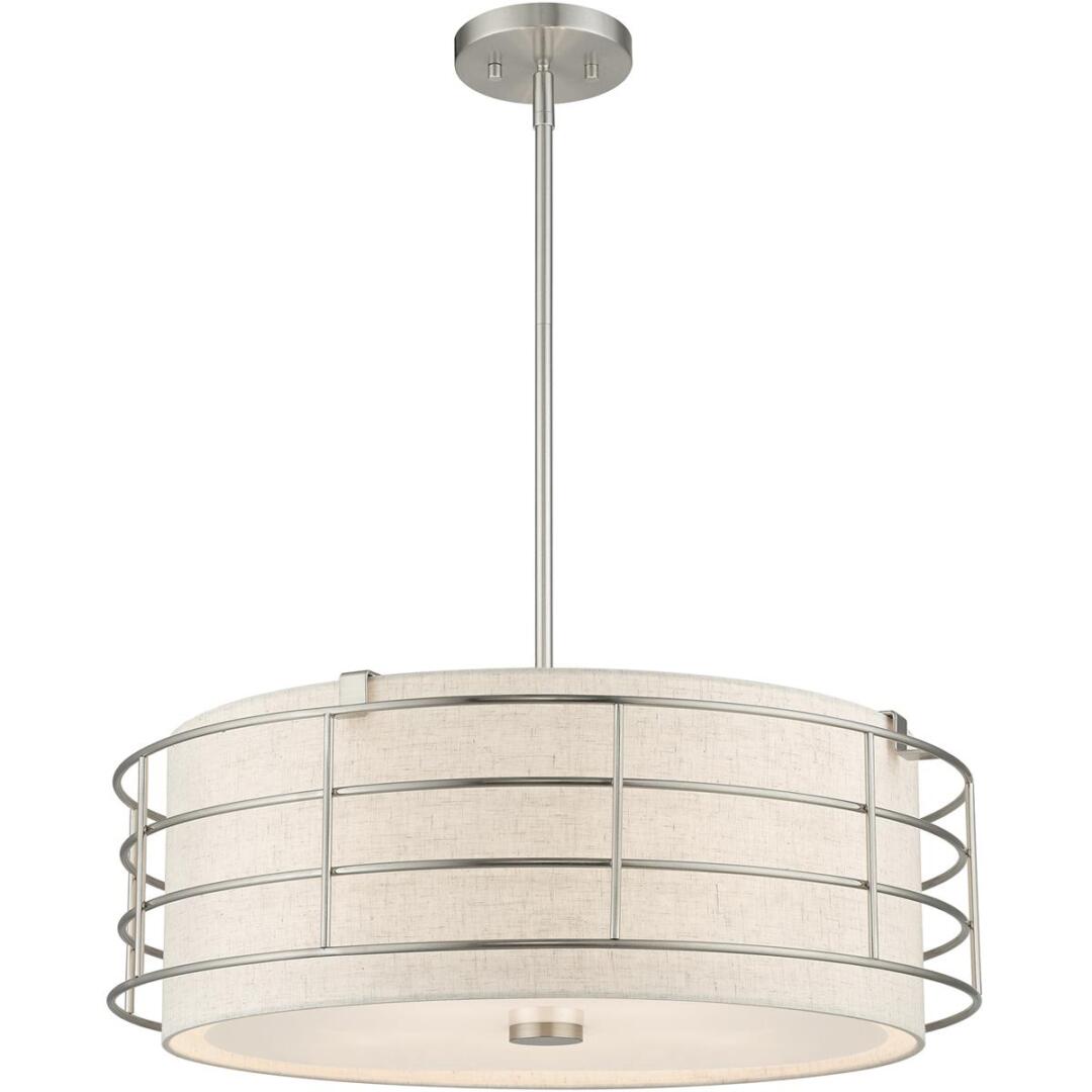 The Blanchard pendant chandelier adds refined style and a hint of mystery to your décor. The brushed nickel finish and an oatmeal handcrafted hardback shade create warm illumination, while soft light brings to life the intricate fretwork pattern. This five-light drum pendant chandelier will add a sophisticated and glamorous look to almost any interior design style. It will work great in the living room, over the dining table or the bedroom.