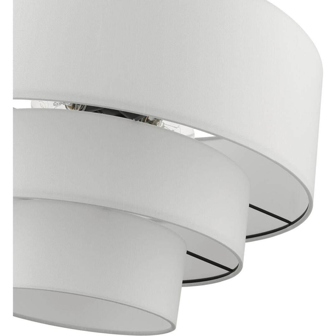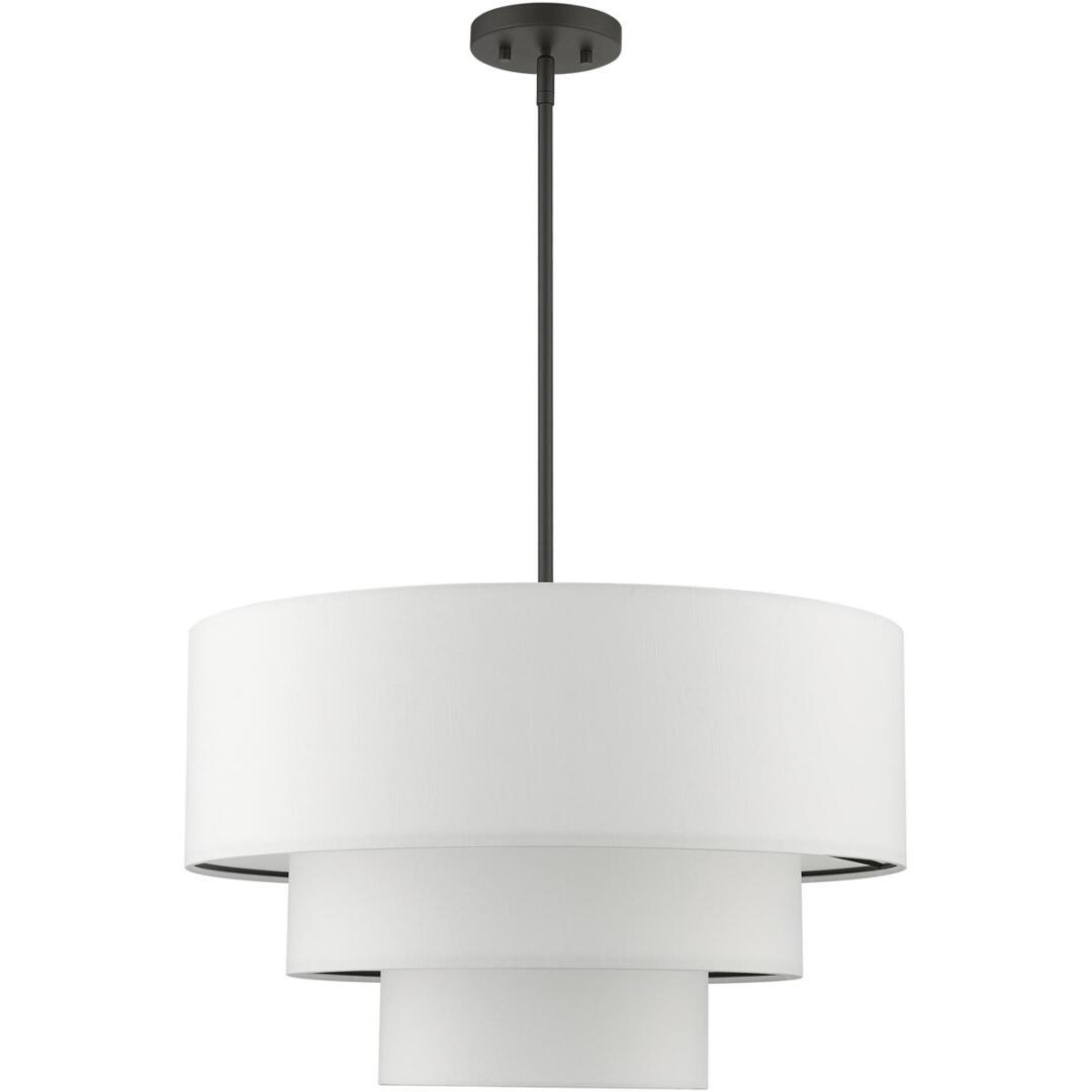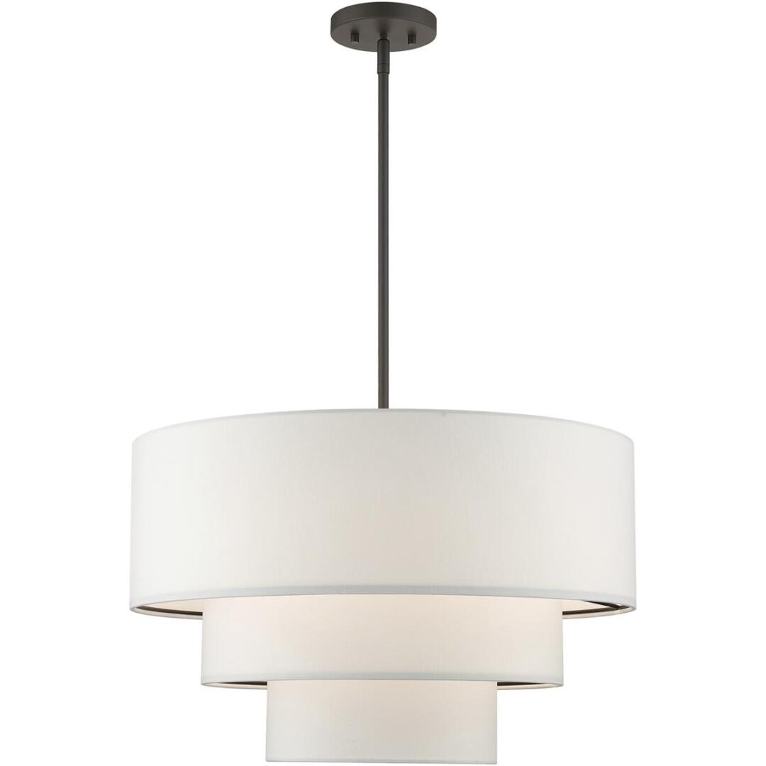 The Carrington pendant chandelier is both modern and versatile. The hand-crafted off-white colored fabric hardback shade is set off by the silky white fabric on the inside setting a pleasant mood. The four-light triple drum shade adds character to this handsomely styled pendant. Perfect fit for the living room, dining room, kitchen and bedroom. This sleek design is shown in a bronze finish.