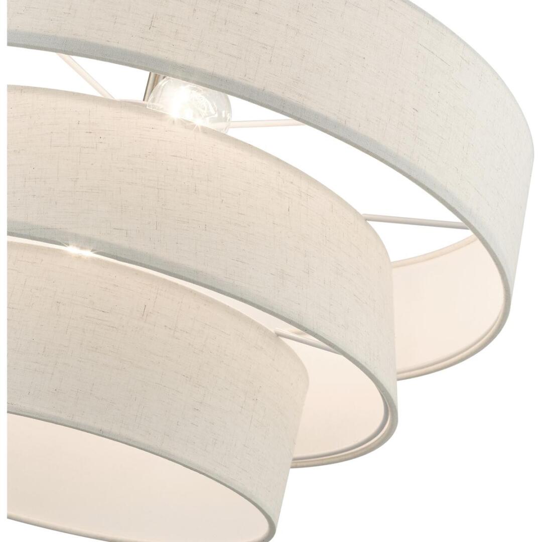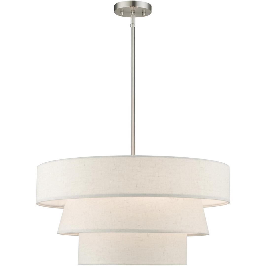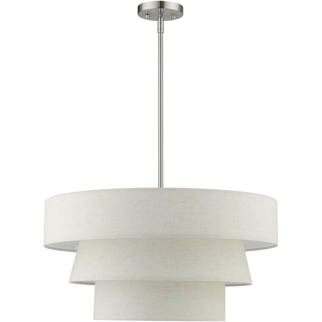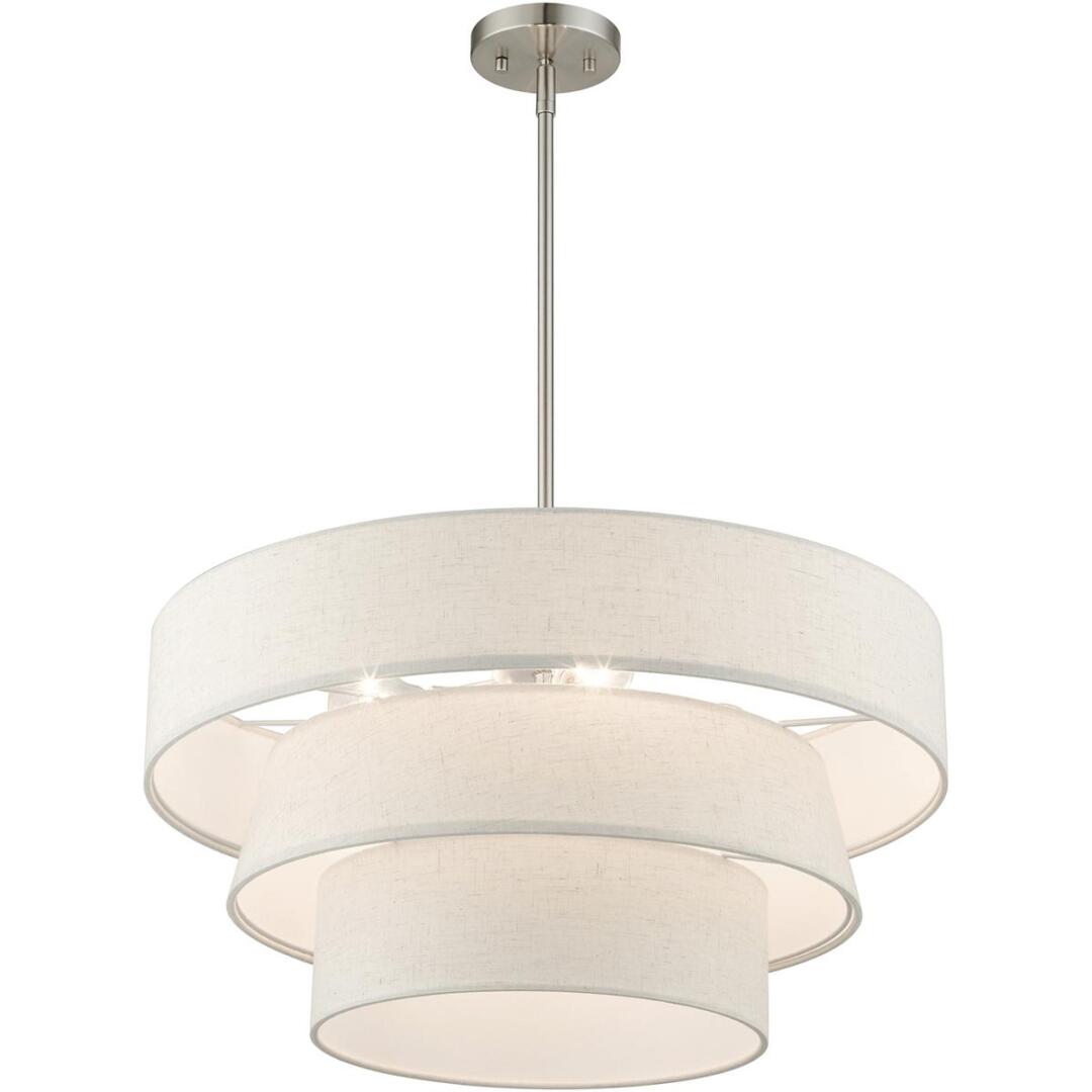 The Chandler pendant chandelier is both modern and versatile. The hand-crafted oatmeal colored fabric hardback shade is set off by the silky white fabric on the inside setting a pleasant mood. The four-light triple drum shade adds character to this handsomely styled pendant. Perfect fit for the living room, dining room, kitchen and bedroom. This sleek design is shown in a brushed nickel finish.