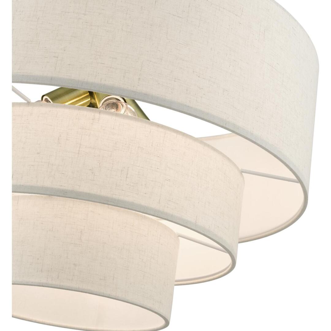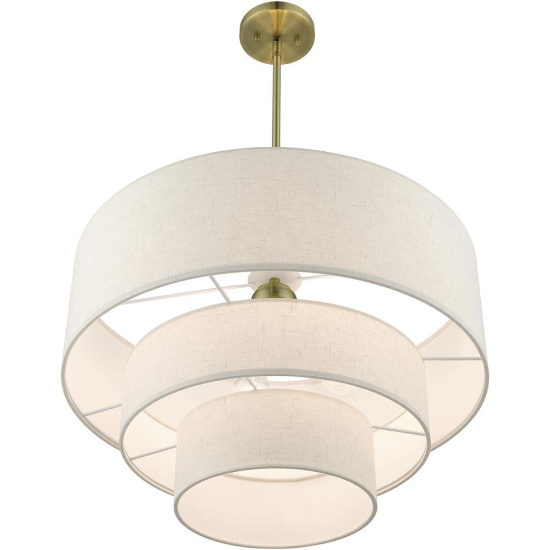 The Gladstone pendant chandelier is both modern and versatile. The hand-crafted oatmeal colored fabric hardback shade is set off by the silky white fabric on the inside setting a pleasant mood. The four-light triple drum shade adds character to this handsomely styled pendant. Perfect fit for the living room, dining room, kitchen and bedroom. This sleek design is shown in an antique brass finish.