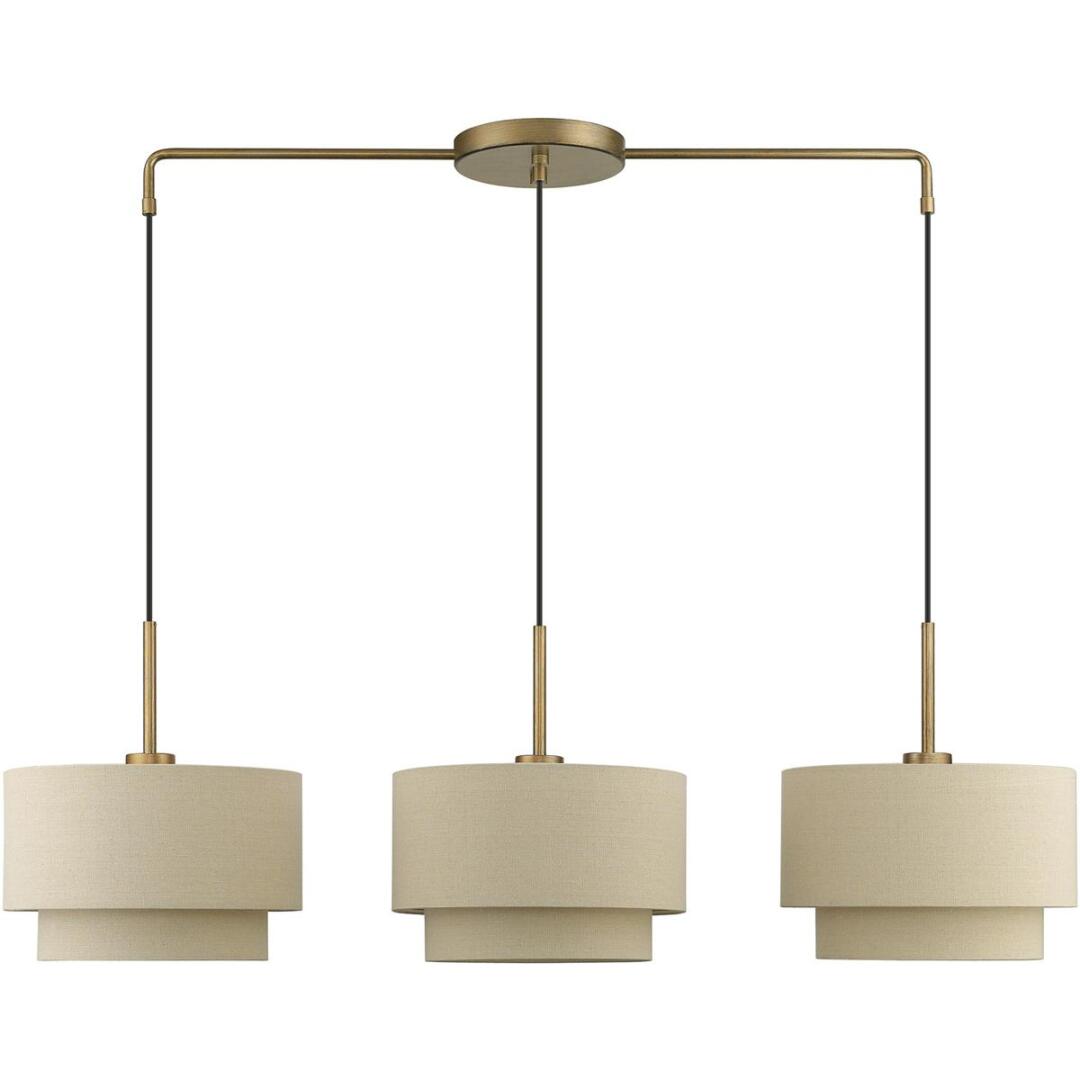 The Gladstone linear chandelier is both modern and versatile. The hand-crafted ash gray colored fabric hardback shades set a pleasant mood. The three-light double drum shades add character to this handsomely styled chandelier. Perfect fit for the dining room and kitchen. This sleek design is shown in an antique gold leaf finish.