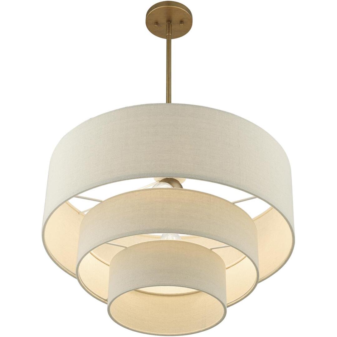 The Gladstone pendant chandelier is both modern and versatile. The hand-crafted ash gray colored fabric hardback shade sets a pleasant mood. The four-light triple drum shade adds character to this handsomely styled pendant. Perfect fit for the living room, dining room, kitchen and bedroom. This sleek design is shown in an antique gold leaf finish.