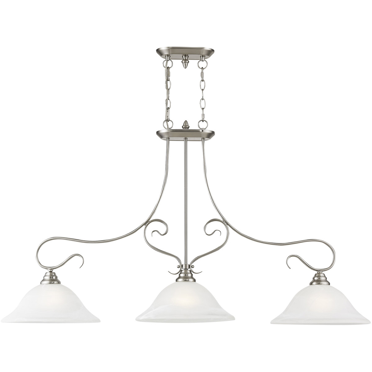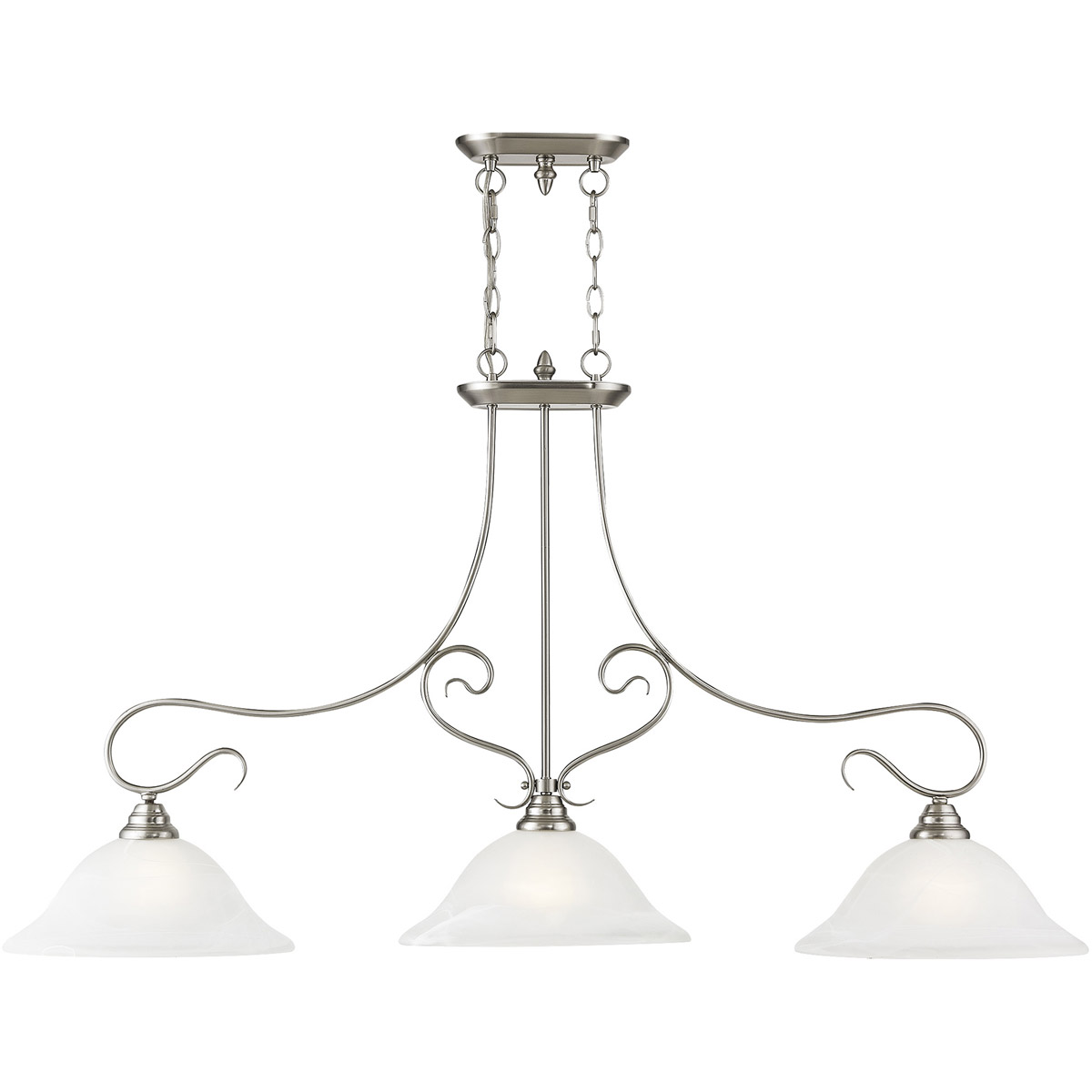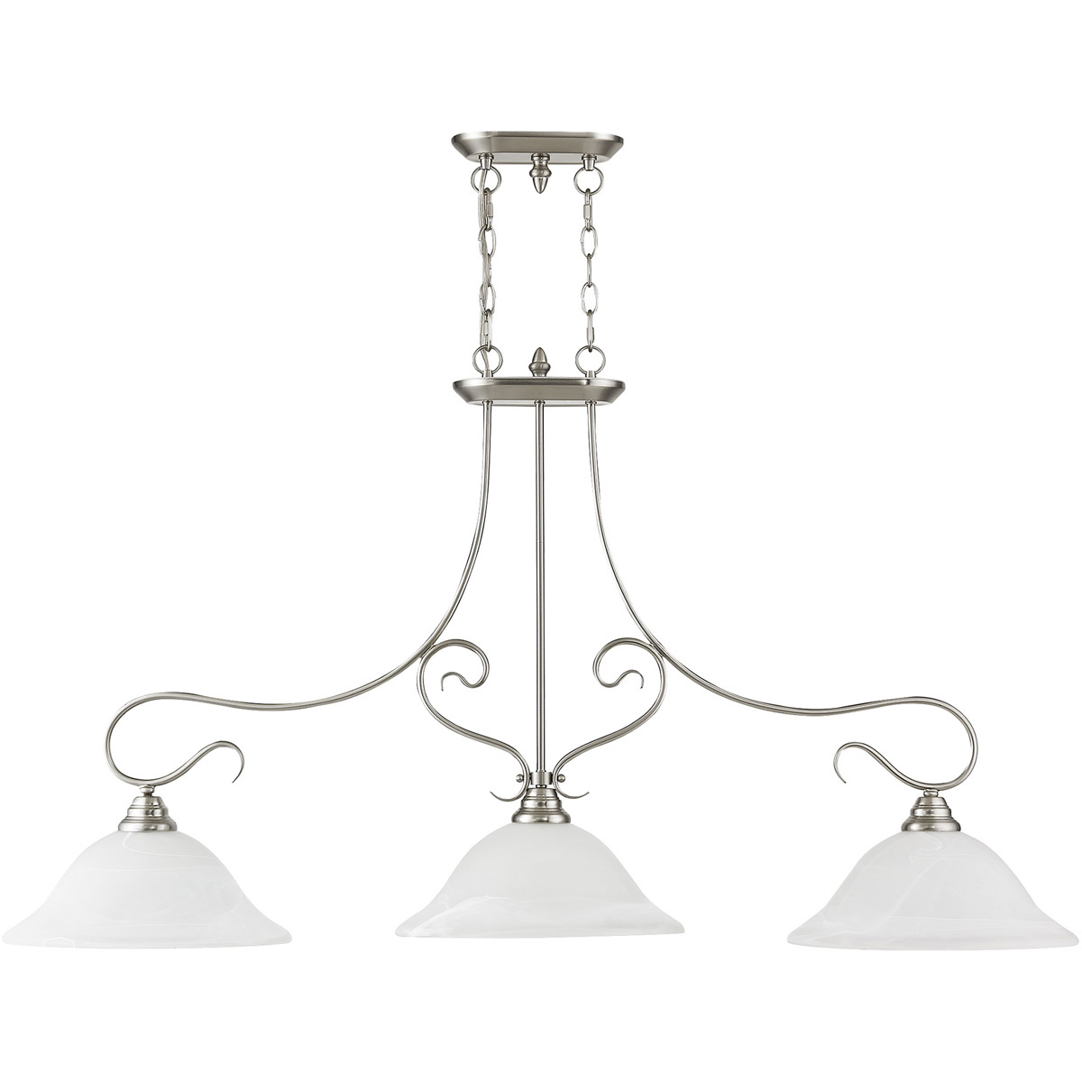 Classic brushed nickel three light linear chandelier paired with white alabaster glass. Timeless in its vintage appeal, this light is stylish for both new and restored homes.