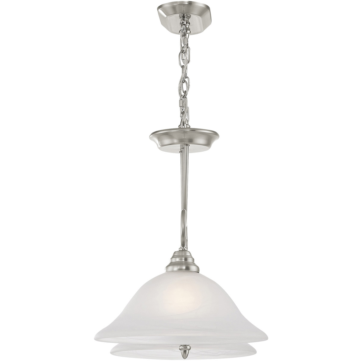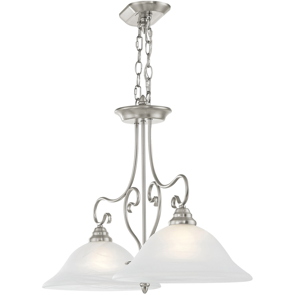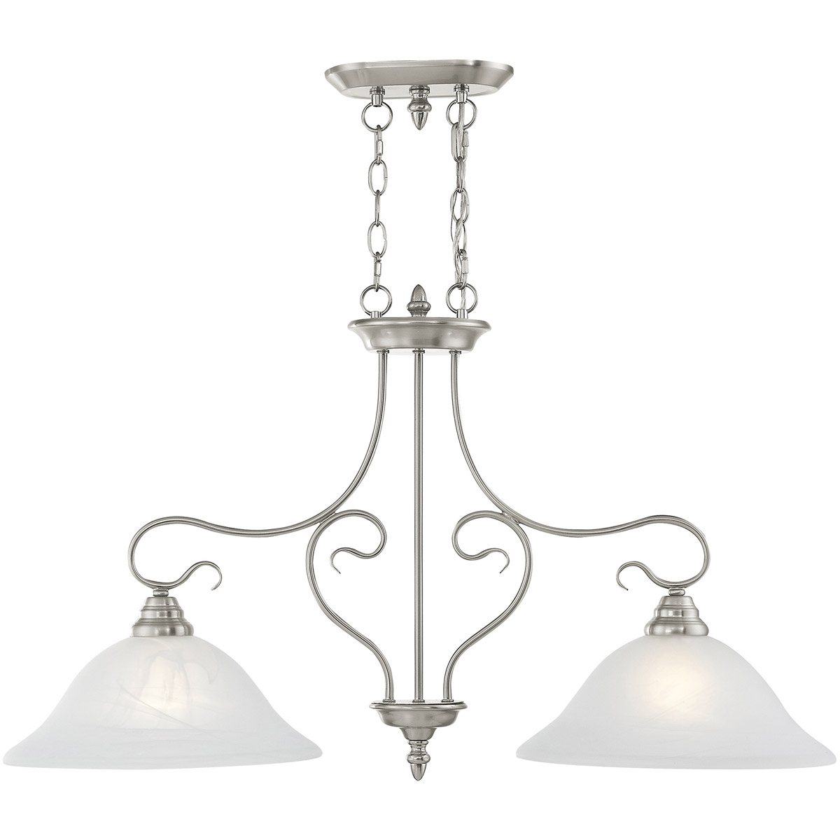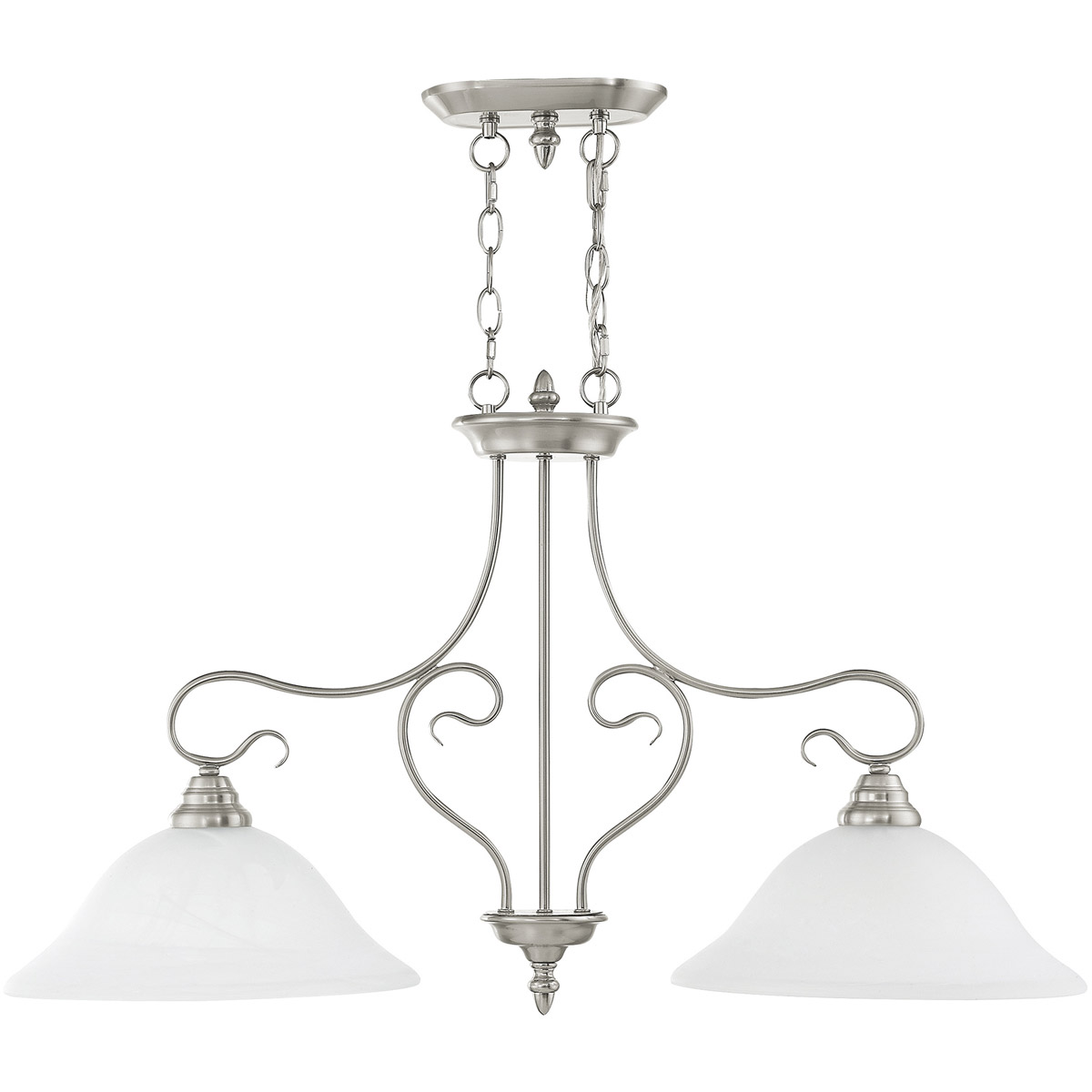 Classic brushed nickel two light linear chandelier paired with white alabaster glass. Timeless in its vintage appeal, this light is stylish for both new and restored homes.