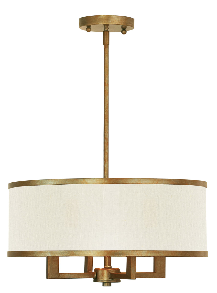 Update your decor with this sleek pendant light design. The angular frame comes in a hand applied antique gold leaf finish which nicely complements the hand crafted parchment color linen fabric hardback shade.
