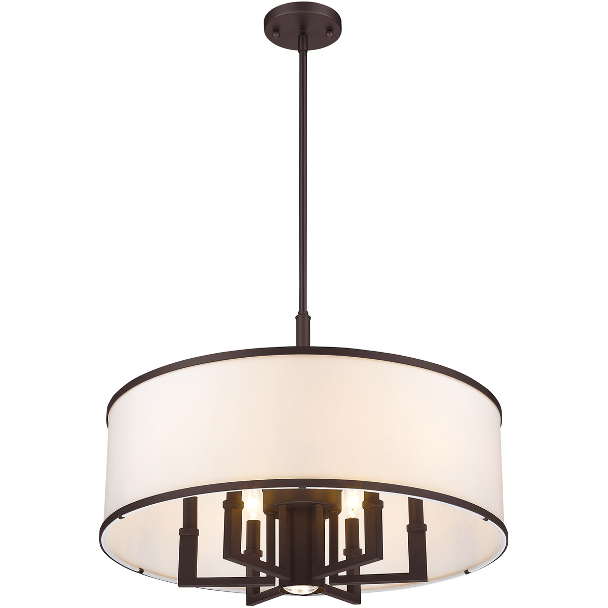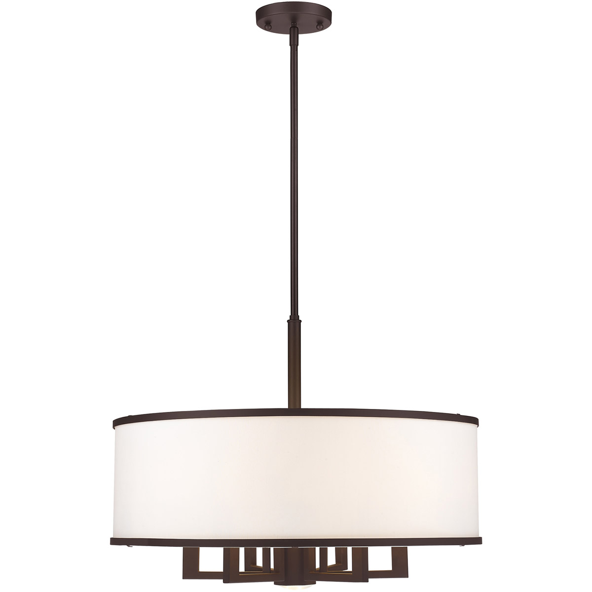 Update your decor with this sleek pendant light design. The angular frame comes in a bronze finish which nicely complements the hand crafted off white fabric hardback shade which holds six bulbs and one downlight to maximize your light output.