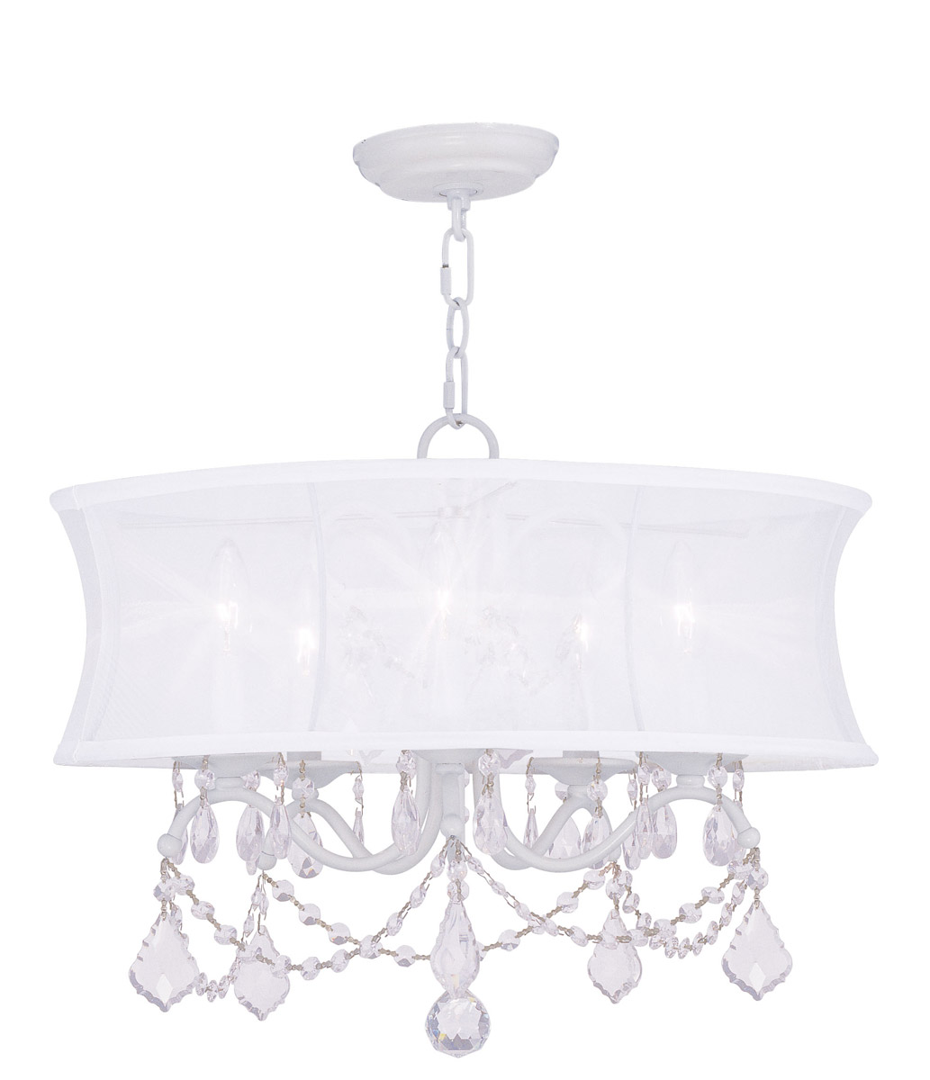 Add glamour to your home with this enchanting shaded chandelier. Scrolling arms adorned in a white finish are paired with glittering crystal drops that reflect light when illuminated. A white handmade silk shimmer shade completes this chic design.