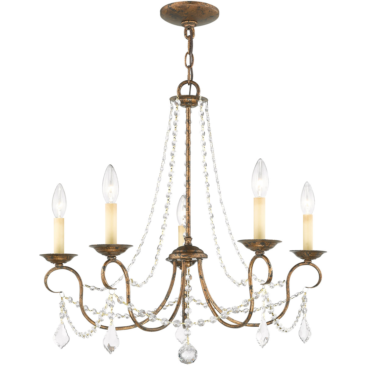 This intricately accented and masterfully forged five light chandelier is from the Pennington collection. Finish is a venetian golden bronze and features include gracefully sculpted arms and with sparkling clear crystal.