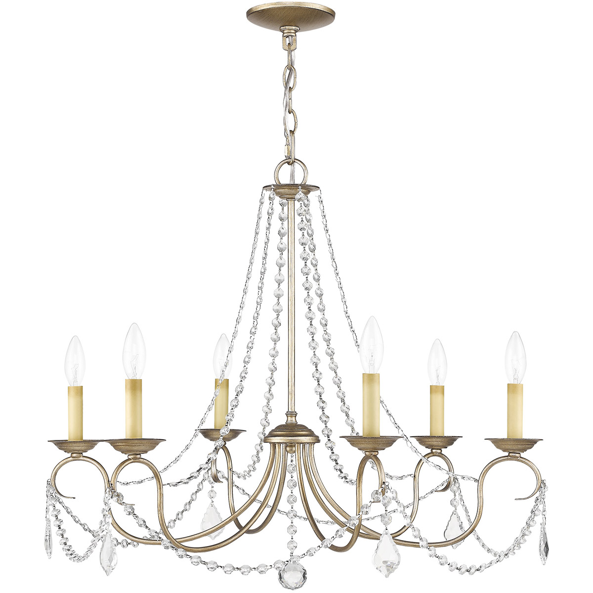 This intricately accented and masterfully forged six light chandelier is from the Pennington collection. Finish is an antique silver leaf and features include gracefully sculpted arms and with sparkling clear crystal.