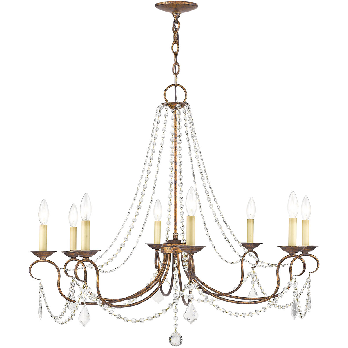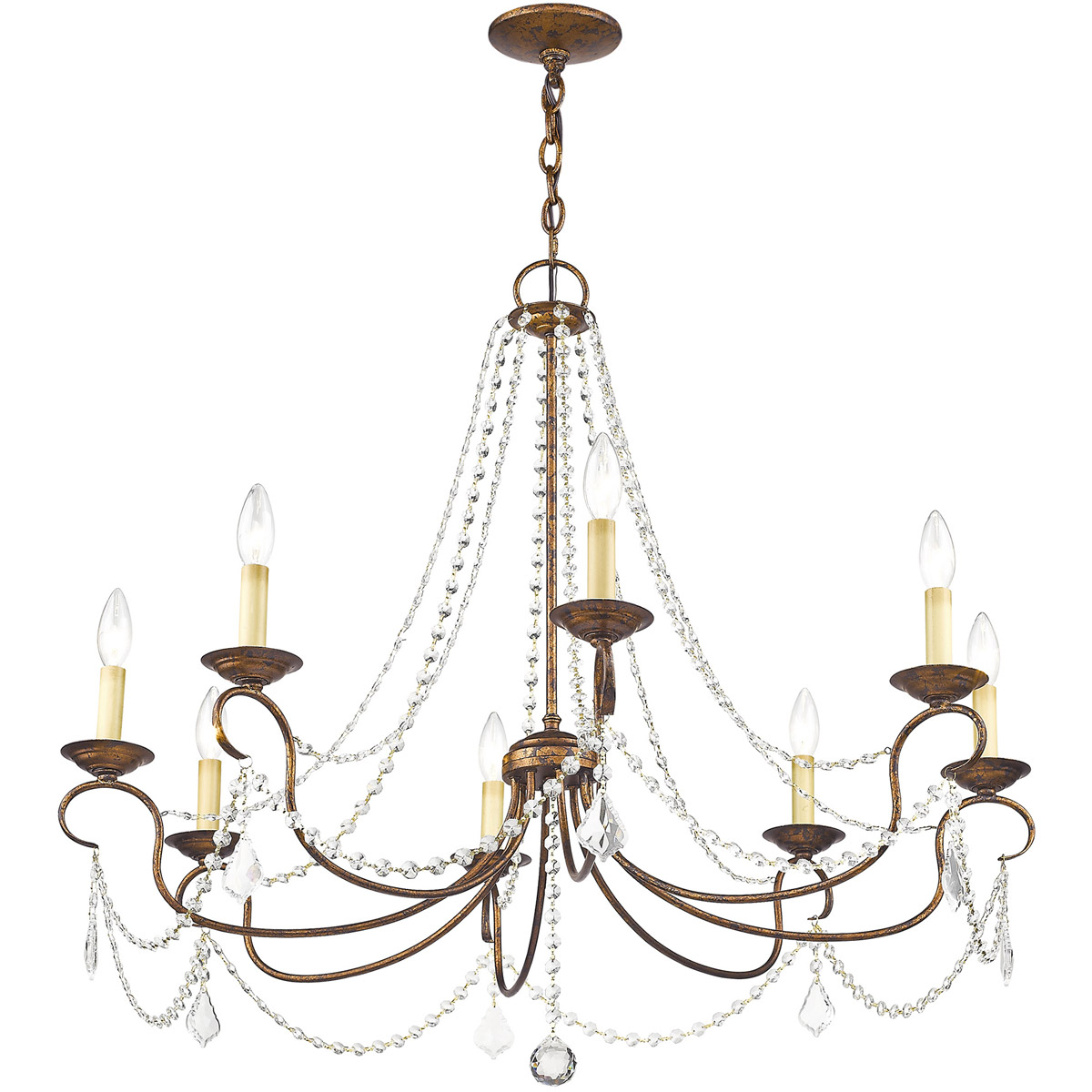 This intricately accented and masterfully forged eight light chandelier is from the Pennington collection. Finish is a venetian golden bronze and features include gracefully sculpted arms and with sparkling clear crystal.