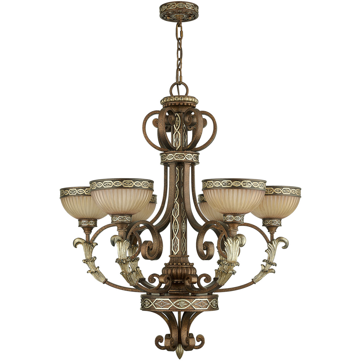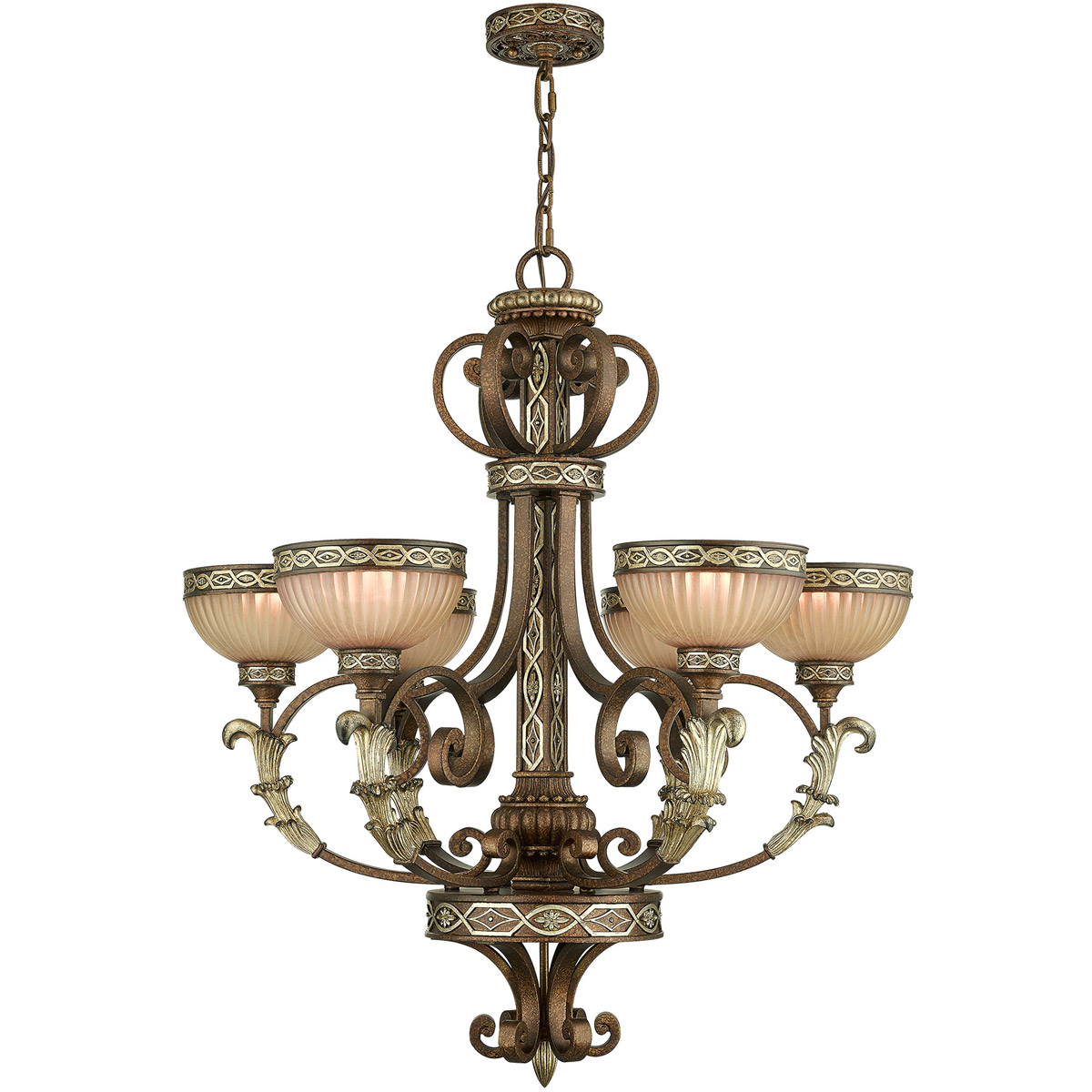 Neoclassical influence is merged with high fashion glamour in this luxurious chandelier. The exquisite gilded accents give this light lasting elegance with the combination of palacial bronze finish and detailed patterns is delightful. Six hand crafted gold dusted art glass shades complement the extensive detail of the fixture.