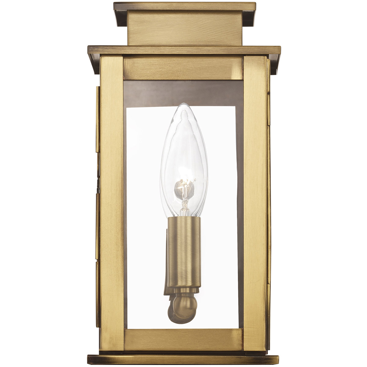 The Princeton collection is a fresh interpretation on the classic English pocket lantern. Hand crafted solid brass, our Princeton fixtures are built for lasting beauty. This outdoor wall light features an antique brass finish and clear glass. This old world charm is built to last.