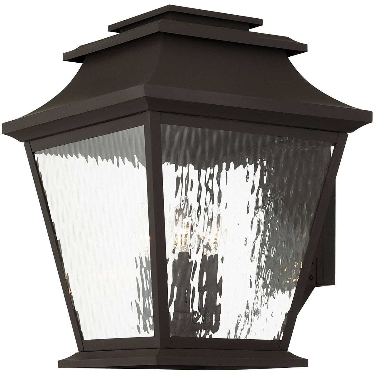 This outdoor wall lantern light looks great near garage doors, entryways, and porches. Our handsome bronze finish is paired with clear water glass and durable solid brass construction for a classic look and feel that works with any home. Candelabra bulbs offer a warm, soft glow, so you can feel both safe and stylish.