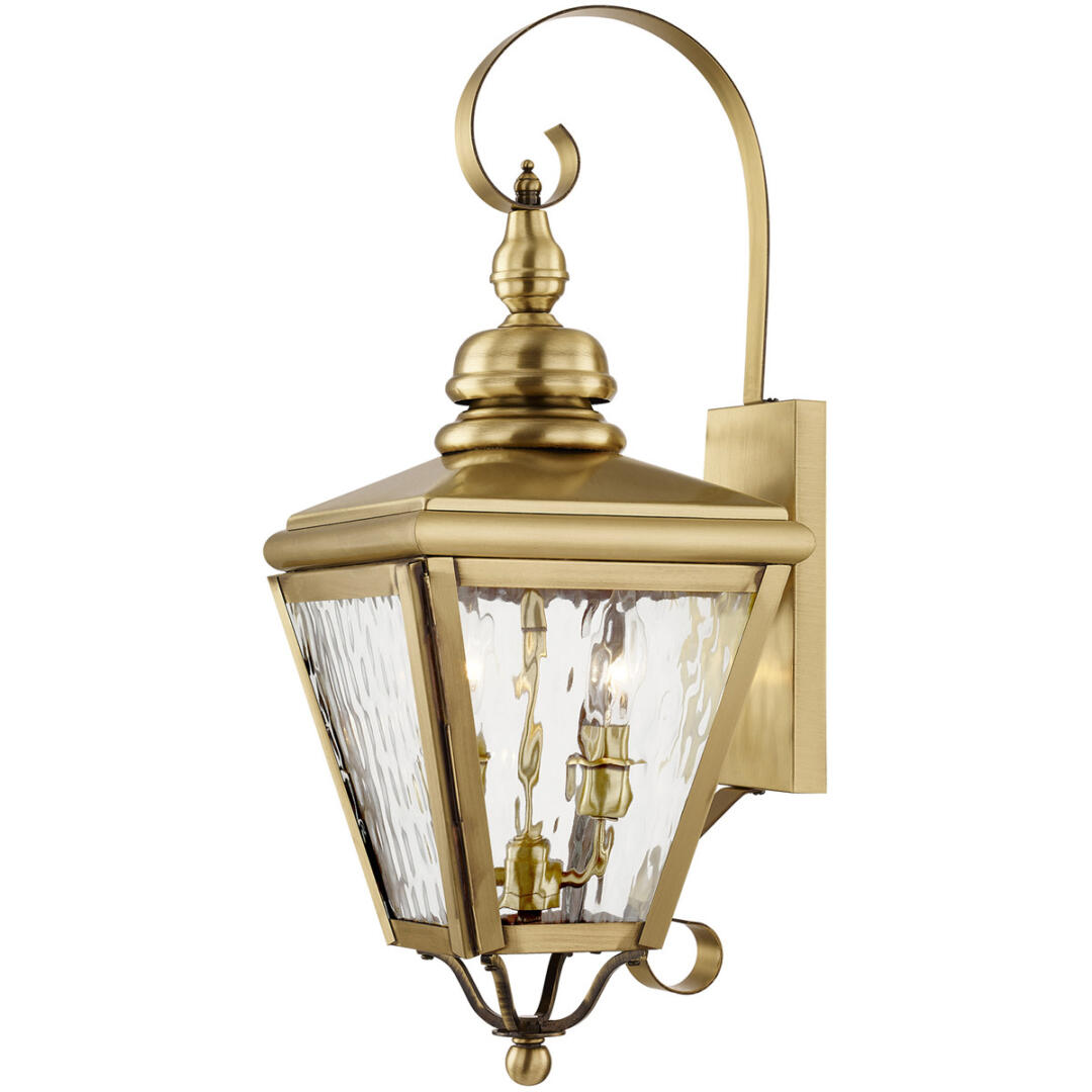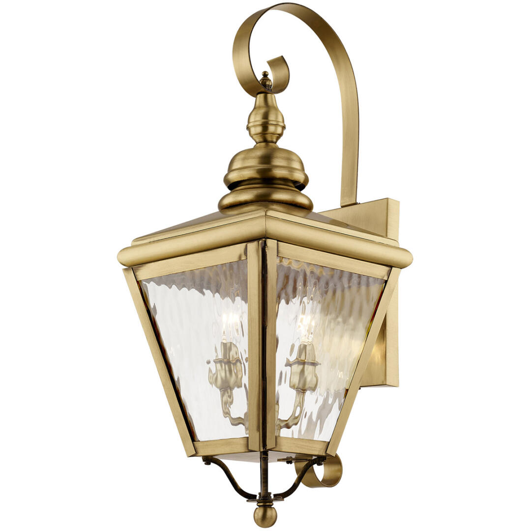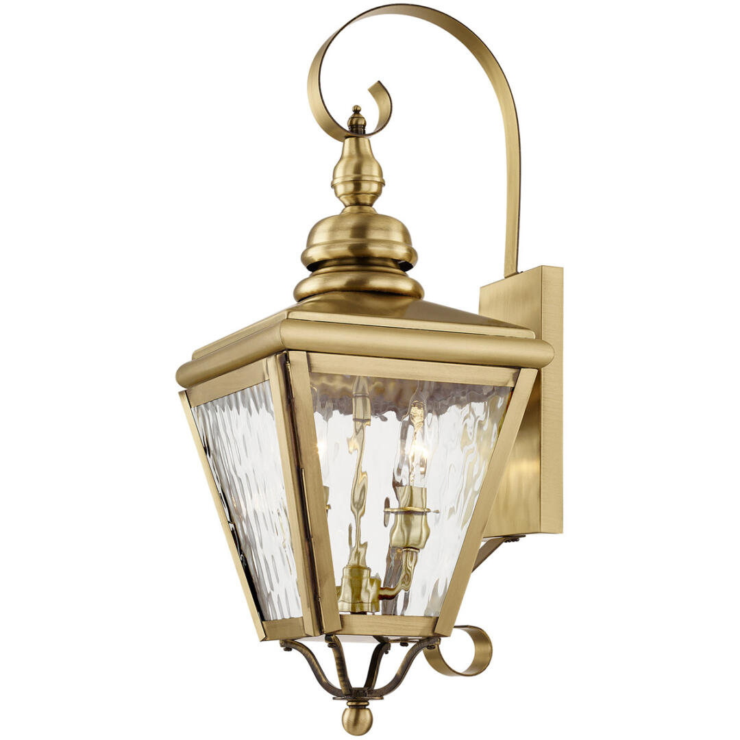 This stylish antique brass outdoor wall lantern is a great way to update your home’s exterior decor. A flat metal curved arm attaches the solid brass decorative housing to the square backplate while clear water glass protects the two bulbs.