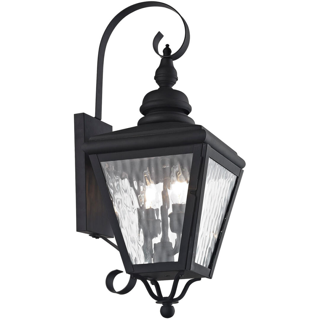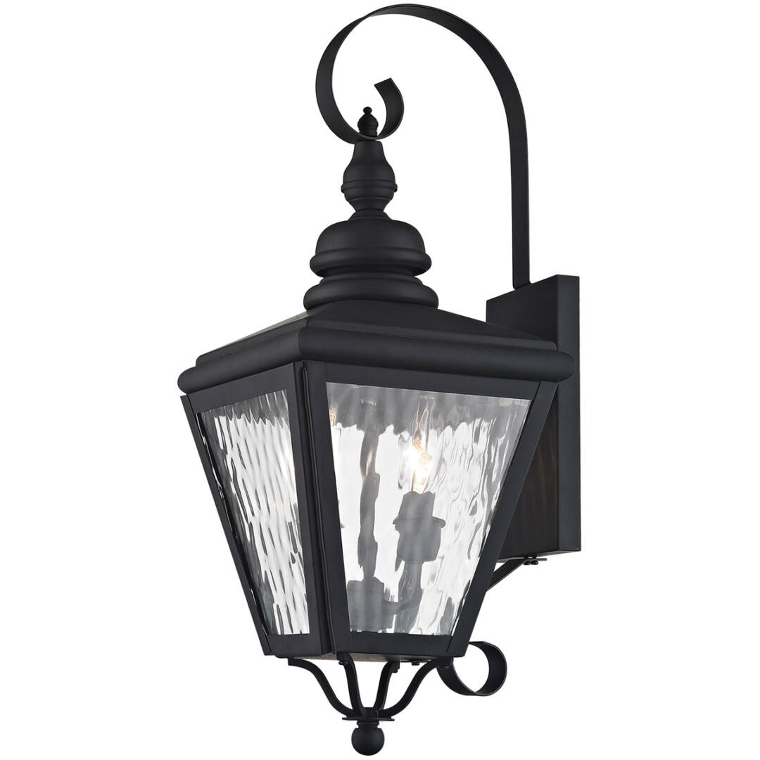 This stylish black outdoor wall lantern is a great way to update your home’s exterior decor. A flat metal curved arm attaches the solid brass decorative housing to the square backplate while clear water glass protects the two bulbs.