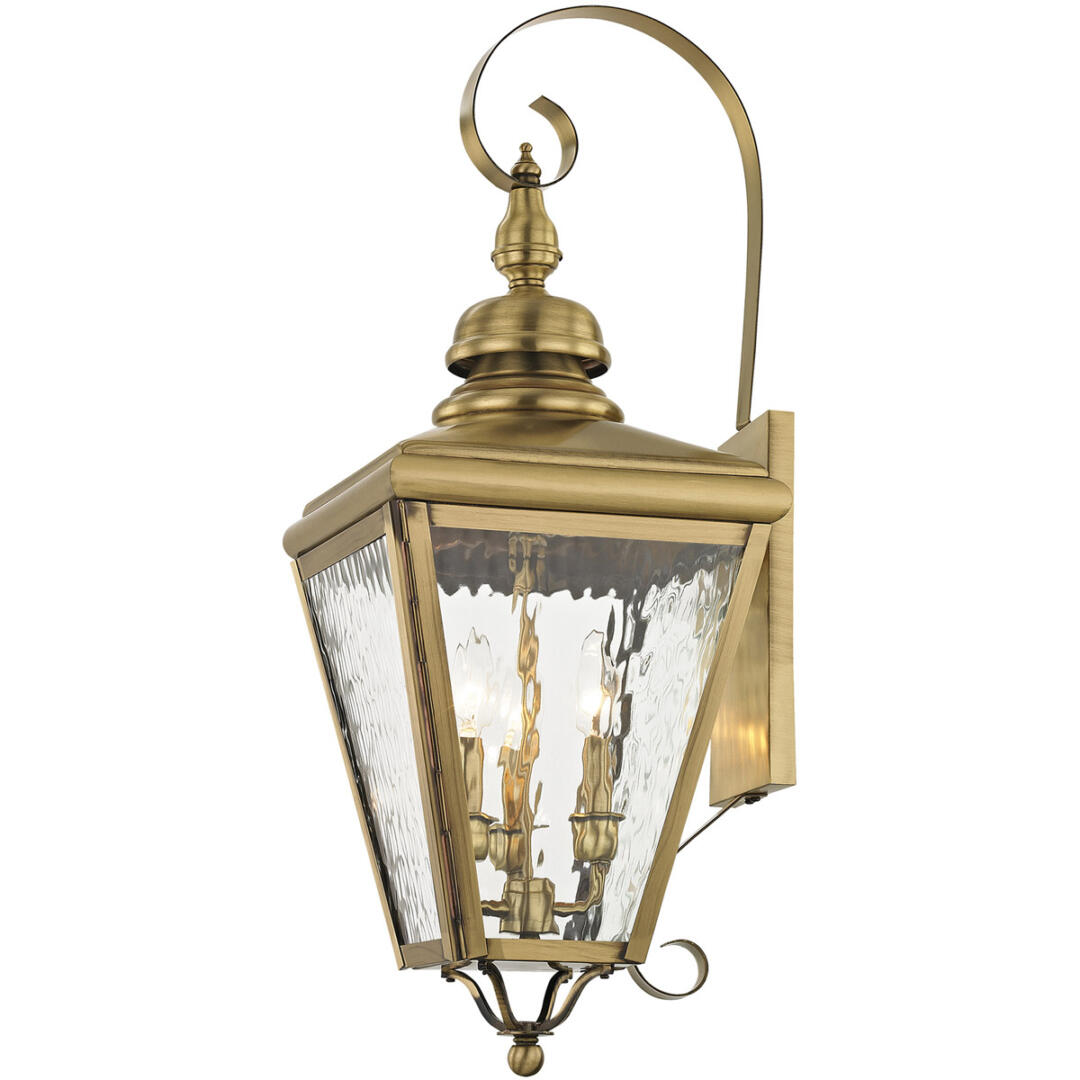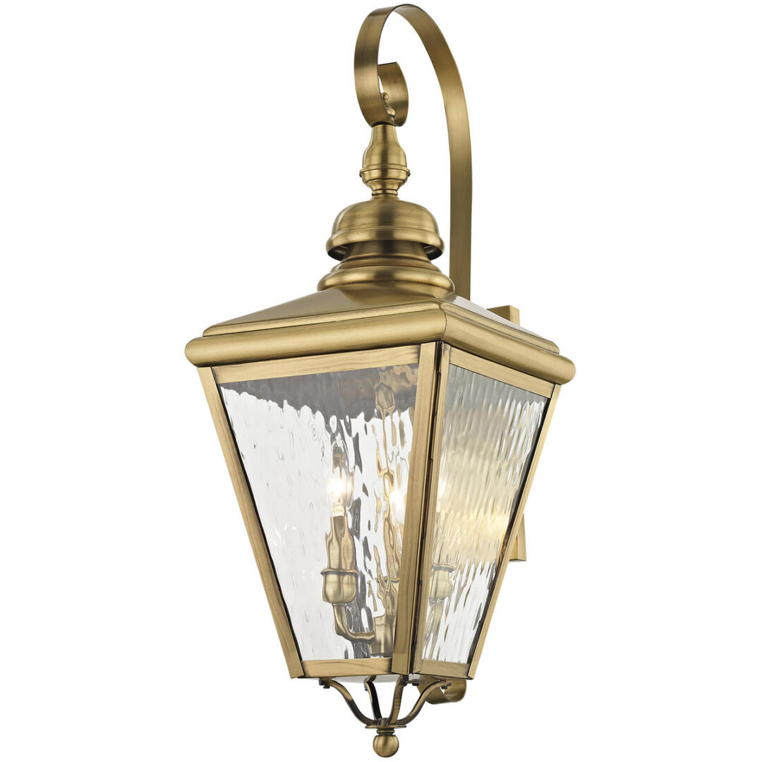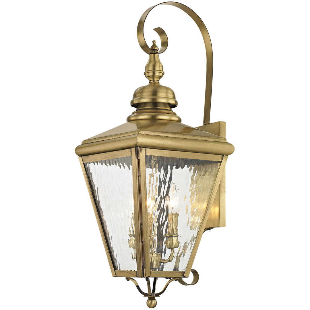 This stylish antique brass outdoor wall lantern is a great way to update your home’s exterior decor. A flat metal curved arm attaches the solid brass decorative housing to the square backplate while clear water glass protects the three bulbs.