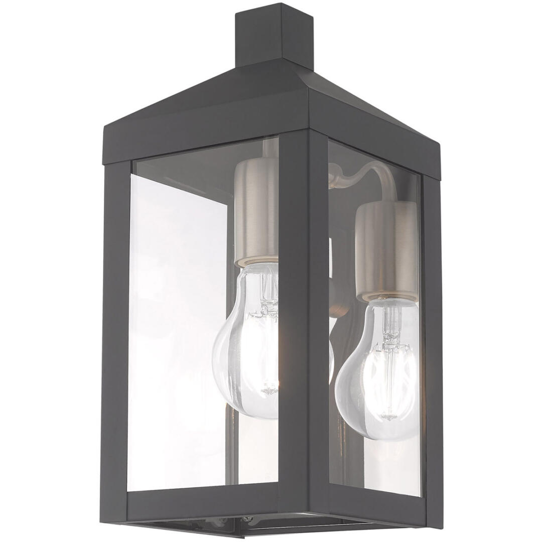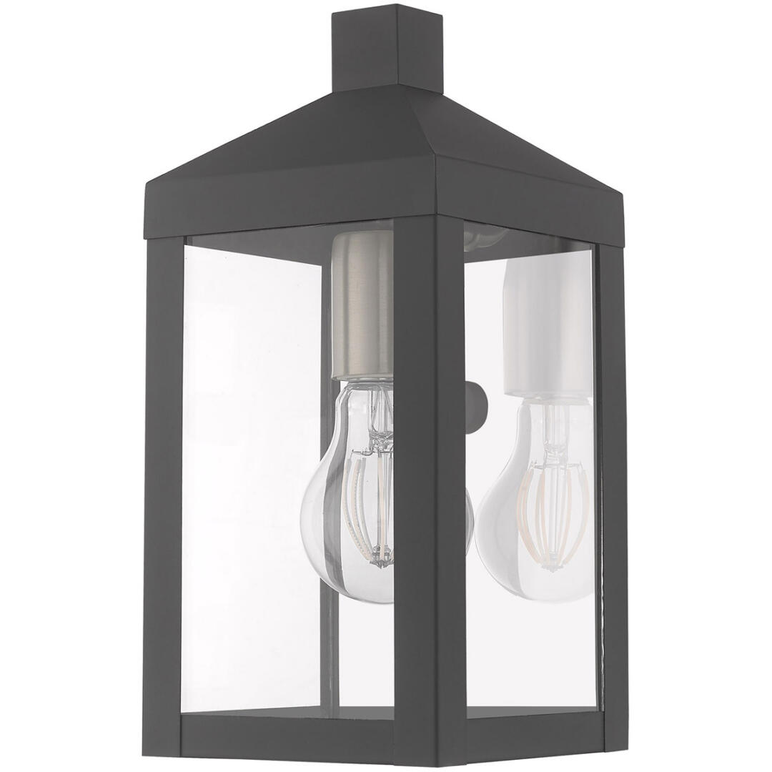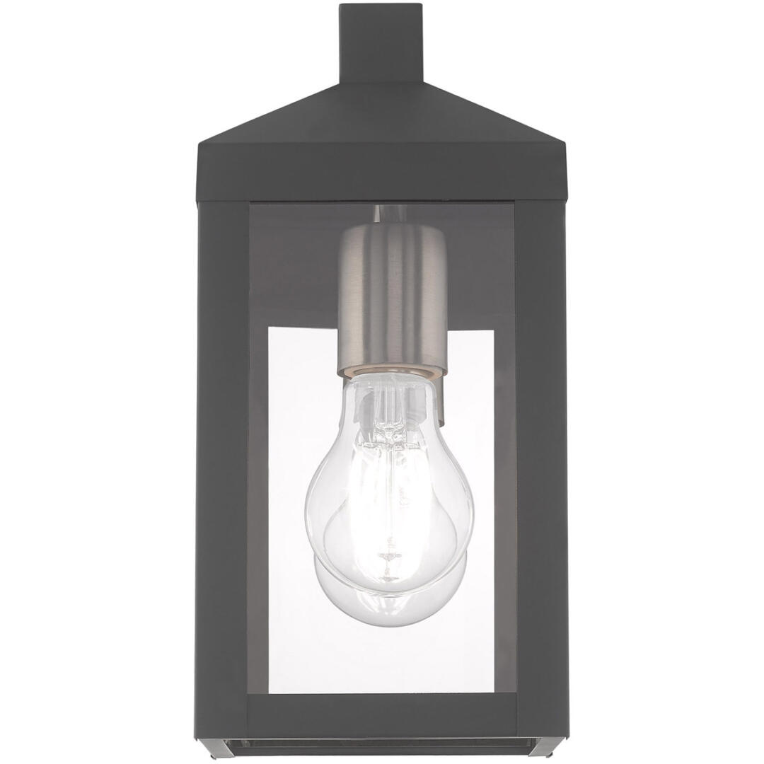 The dramatically simple shape and bold lines help define our Nyack wall lantern. Featured in a Scandinavian gray finish with panels of clear glass.