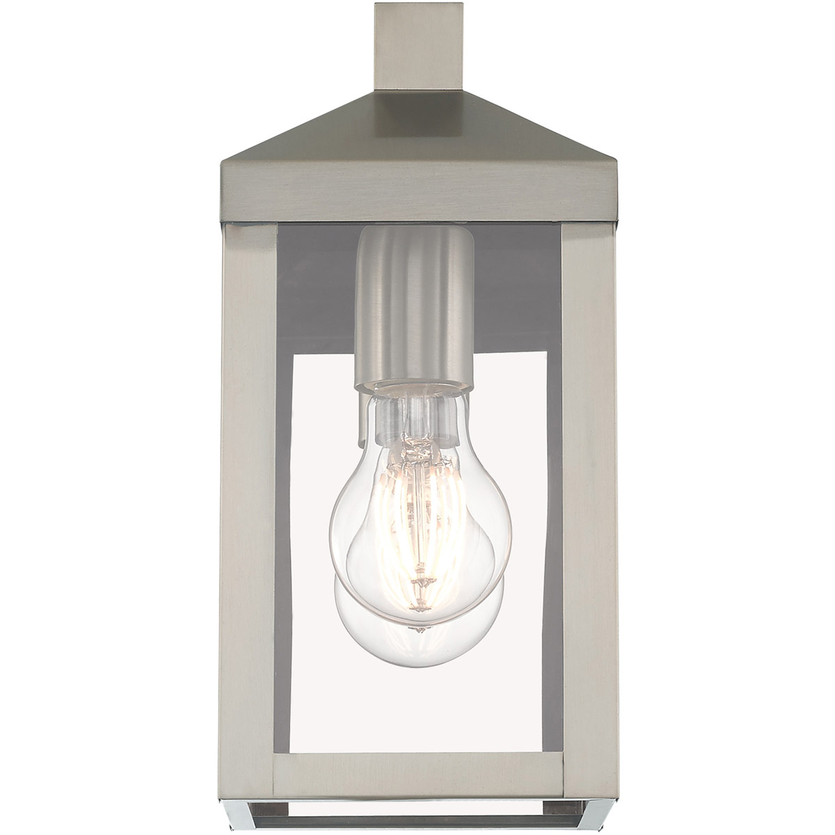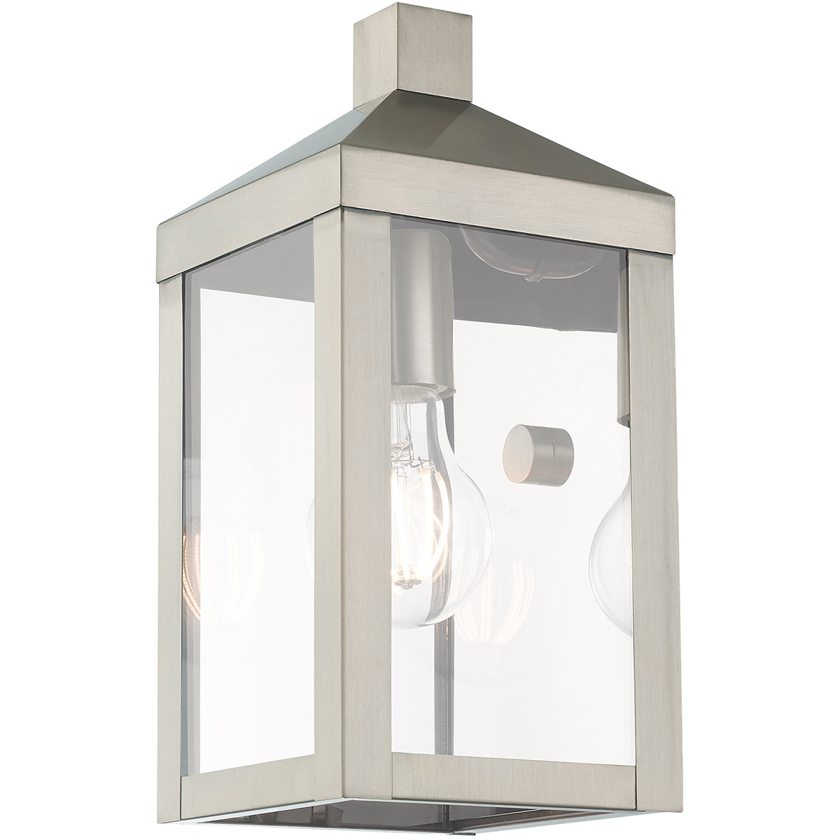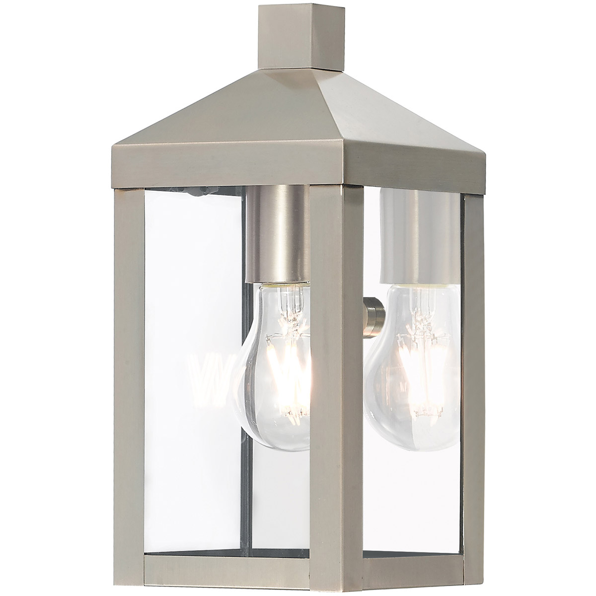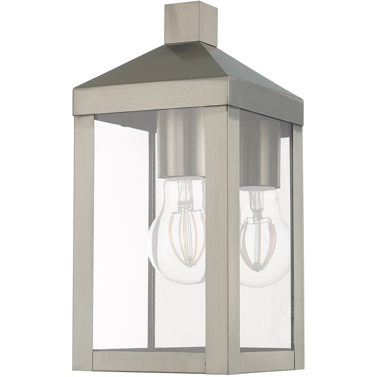 The dramatically simple shape and bold lines help define our Nyack wall lantern. Featured in a brushed nickel finish, this outdoor wall lantern has panels of clear glass.
