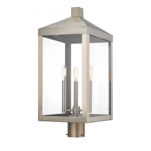 The dramatically simple shape and bold lines help define our Nyack post top lantern. Featured in a brushed nickel finish, this outdoor post top lantern has panels of clear glass.