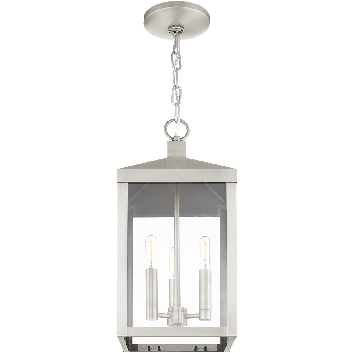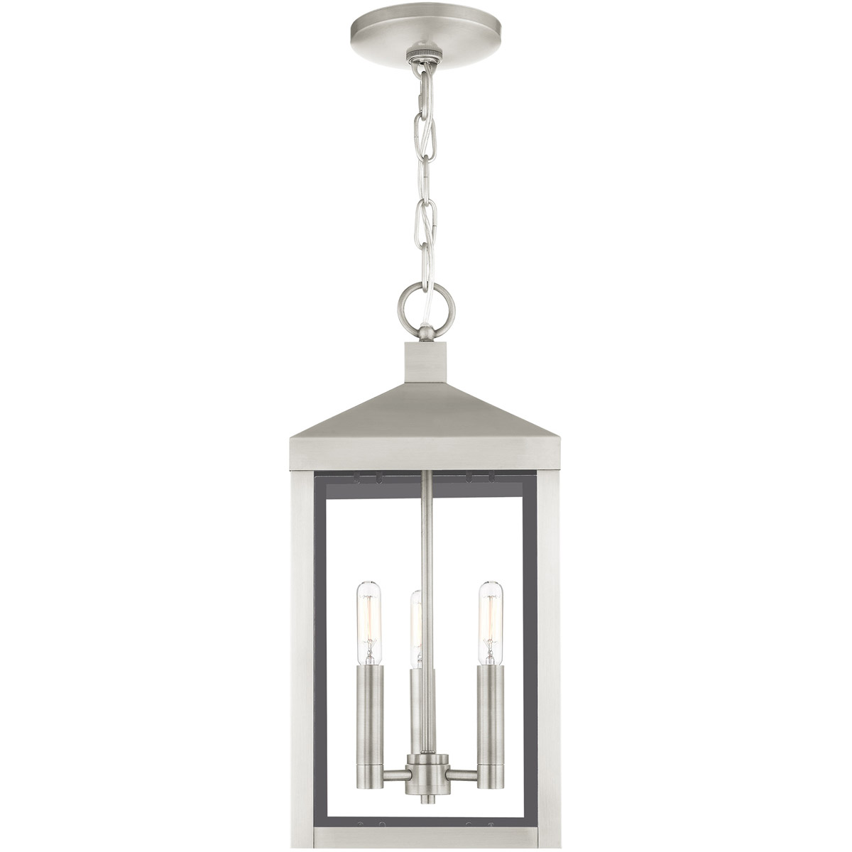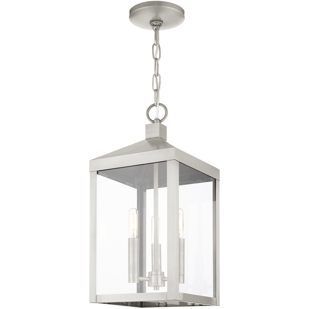 The dramatically simple shape and bold lines help define our Nyack wall lantern. Featured in a brushed nickel finish, this outdoor pendant lantern has panels of clear glass.