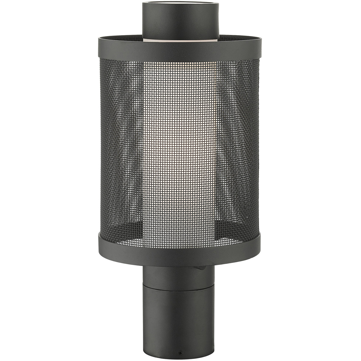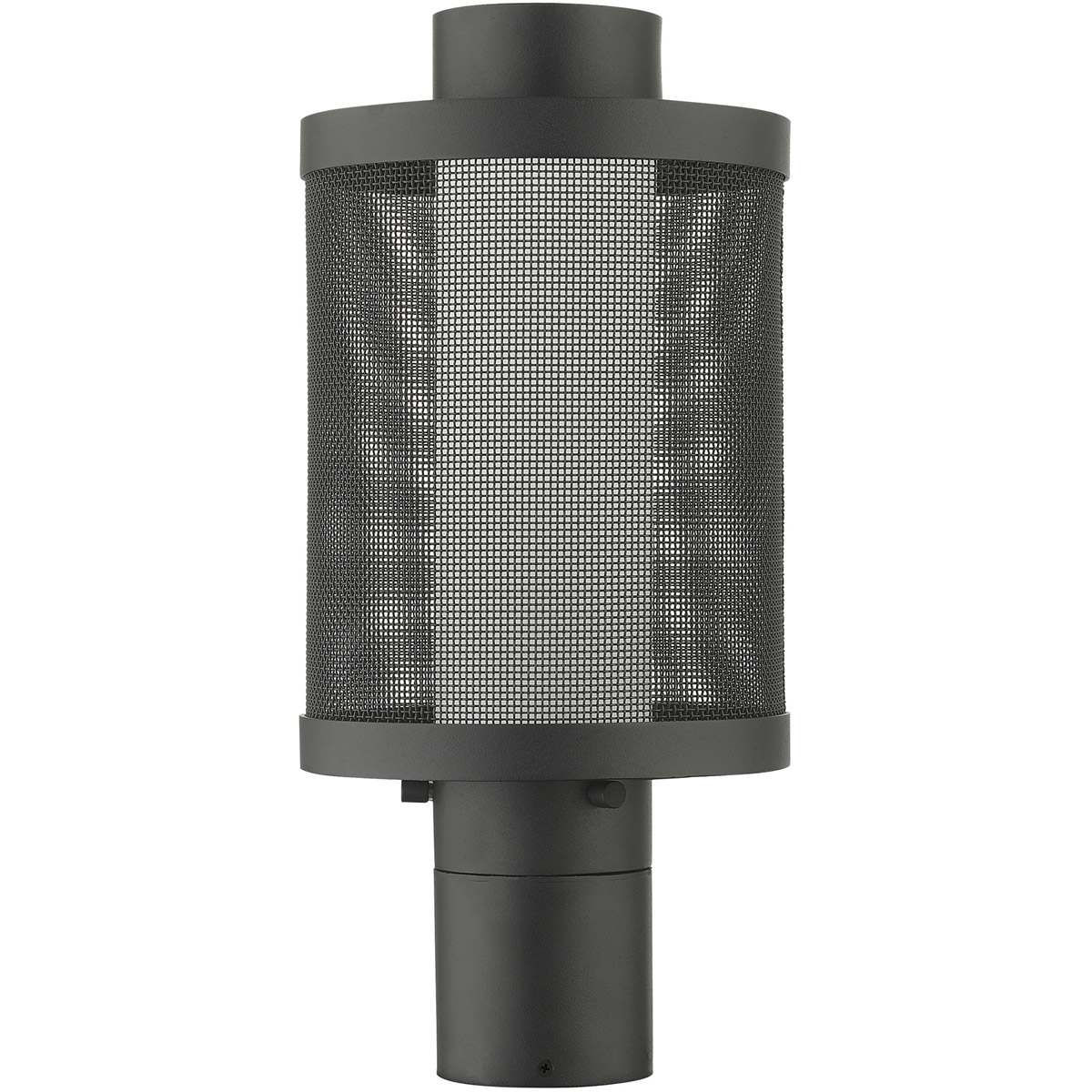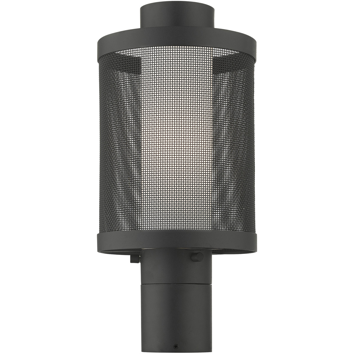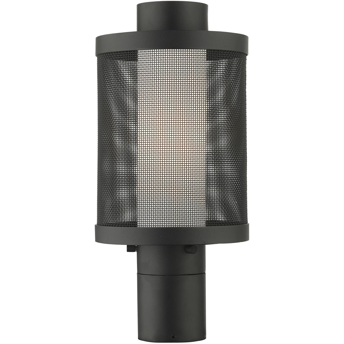 The Nottingham outdoor collection has a clean, crisp look and contemporary appeal. This single light stainless steel medium post top lantern has a textured black finish and features a sleek stainless steel mesh shade with satin opal white glass.