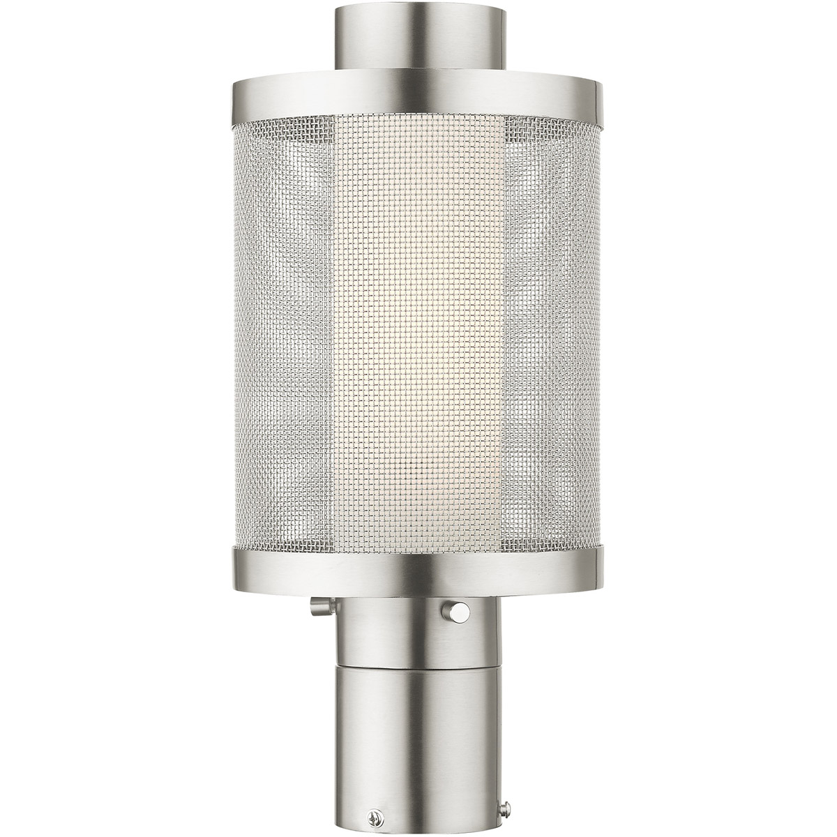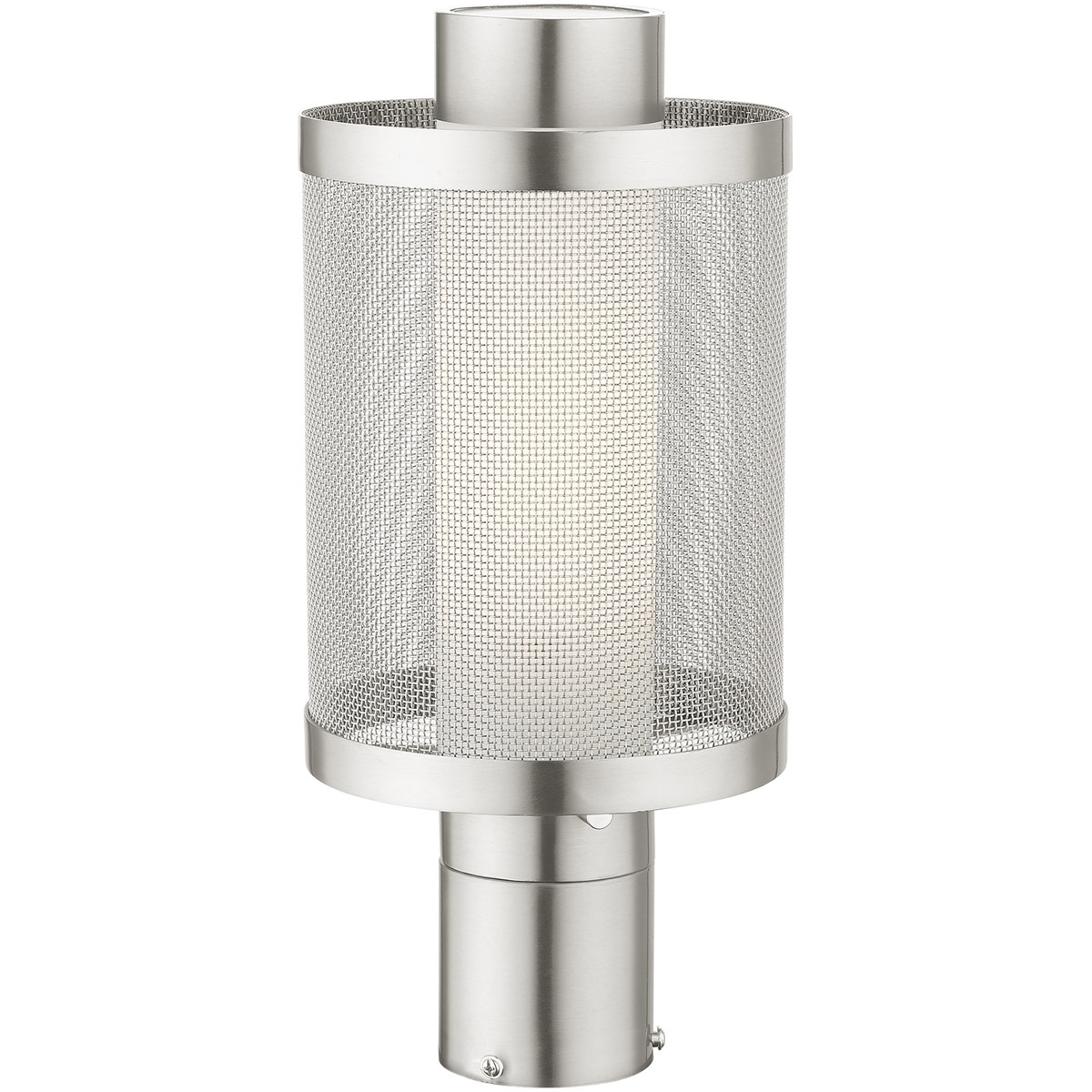 The Nottingham outdoor collection has a clean, crisp look and contemporary appeal. This single light stainless steel medium post top lantern has a brushed nickel finish and features a sleek stainless steel mesh shade with satin opal white glass.