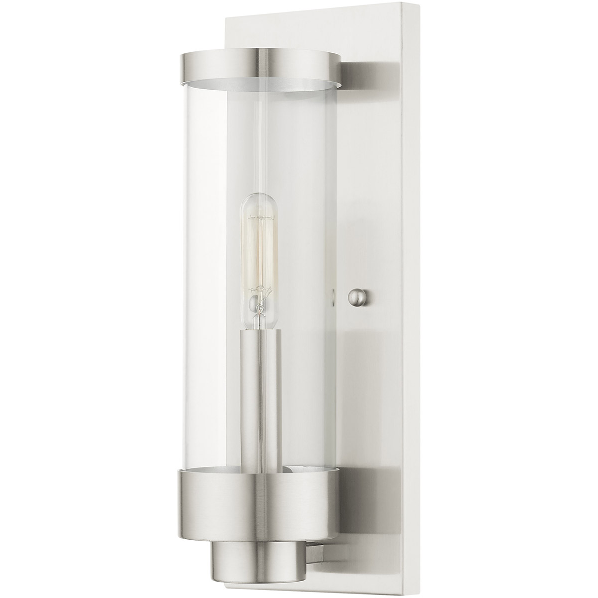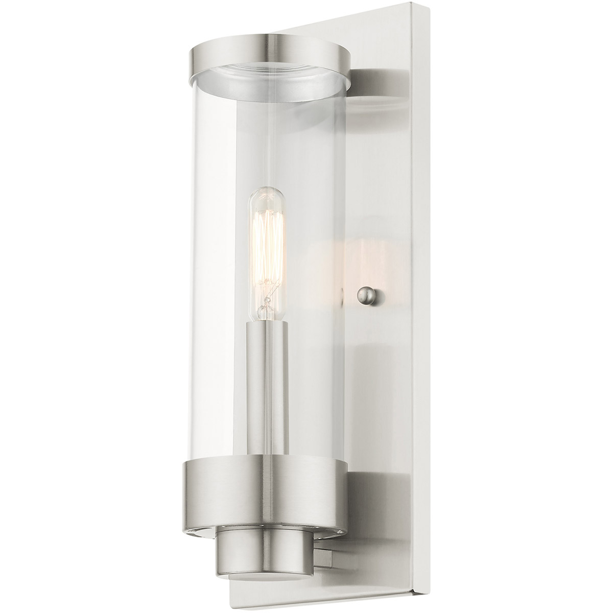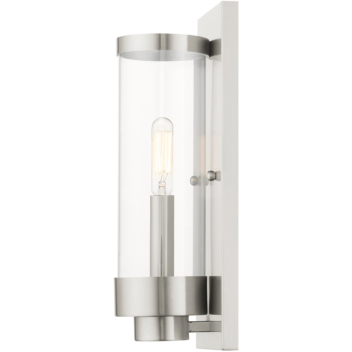 The one light outdoor wall lantern from the Hillcrest collection made of rugged stainless steel features a simple elegant brushed nickel frame paired with closed top clear glass shade. The shade is accented with a banded brushed nickel ring to carry through the theme of finely crafted metal fittings.
