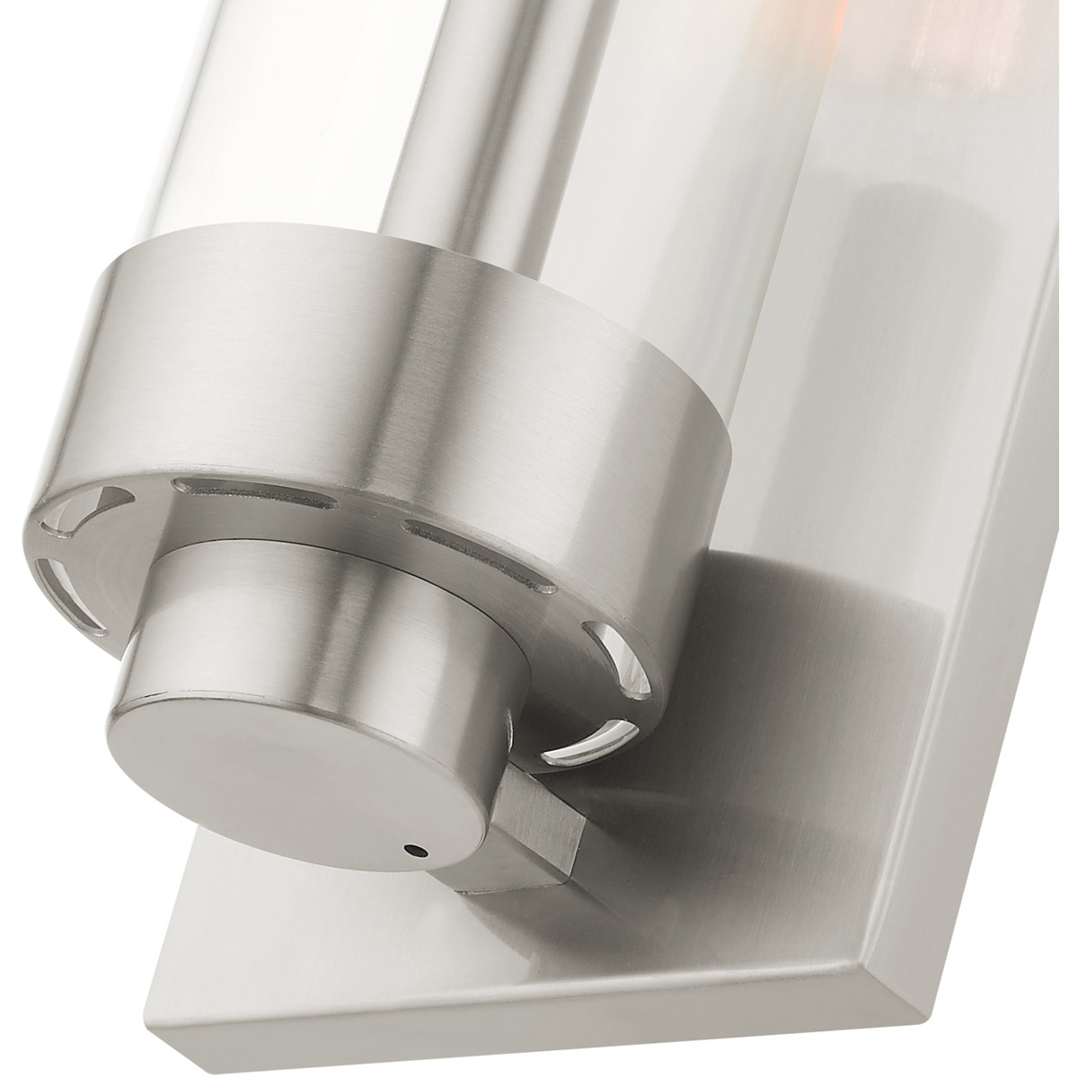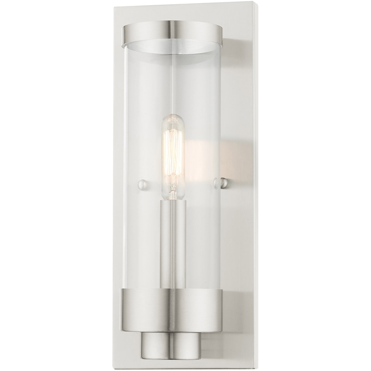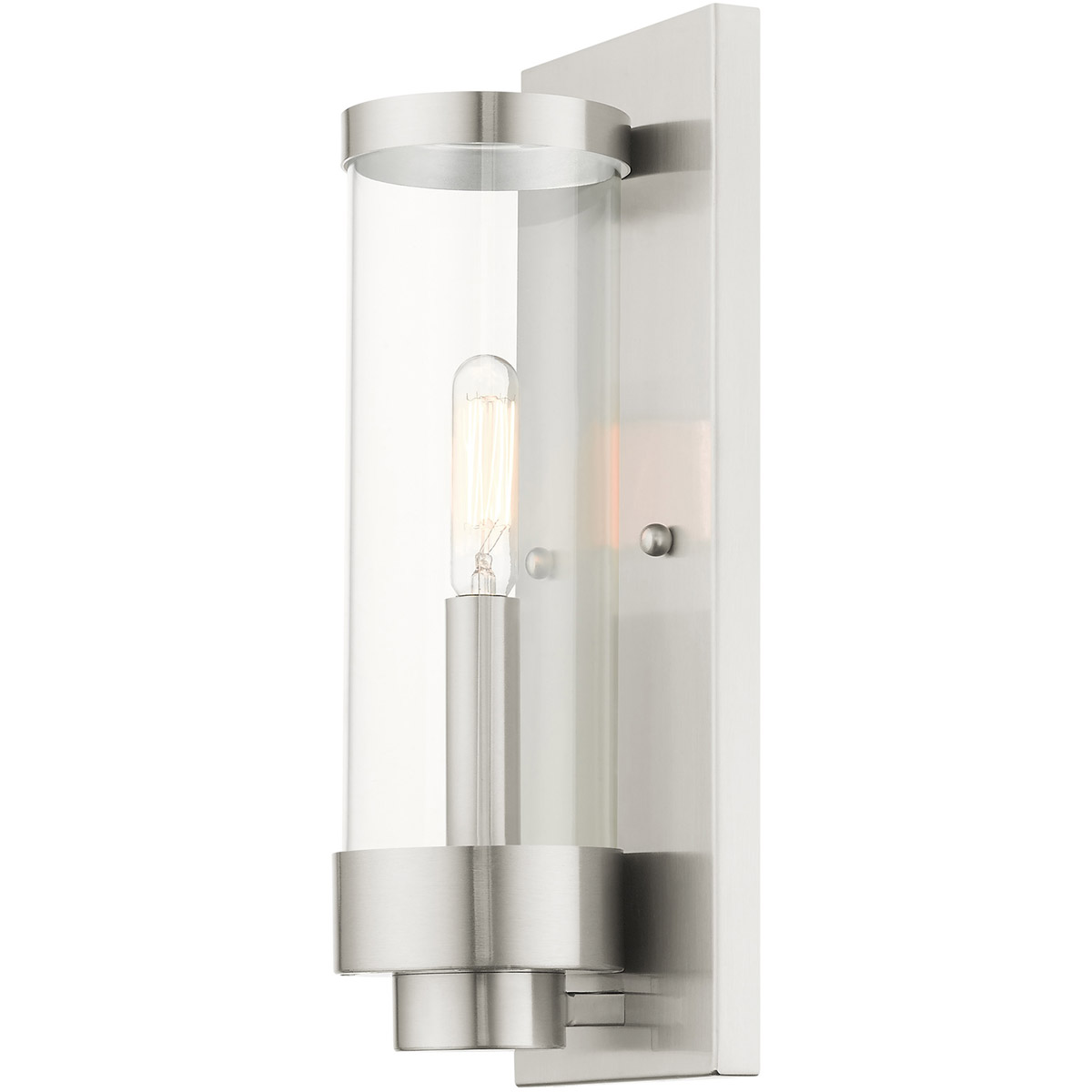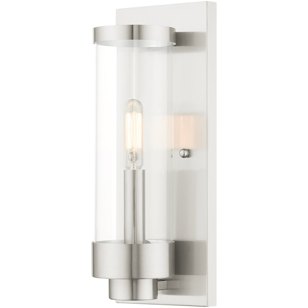 The one light outdoor wall lantern from the Hillcrest collection made of rugged stainless steel features a simple elegant brushed nickel frame paired with closed top clear glass shade. The shade is accented with a banded brushed nickel ring to carry through the theme of finely crafted metal fittings.