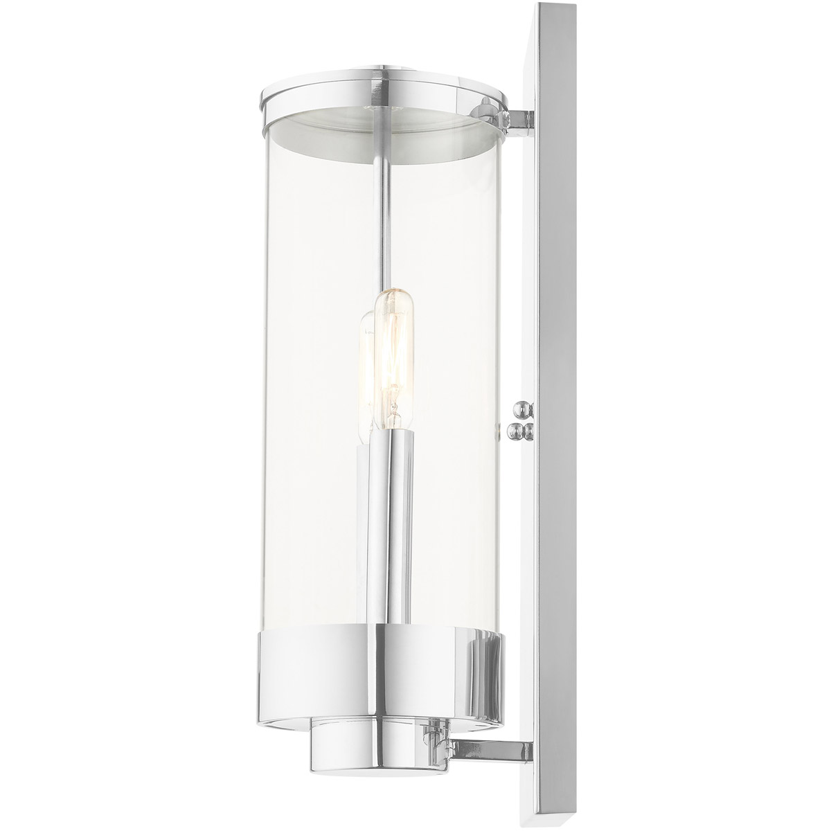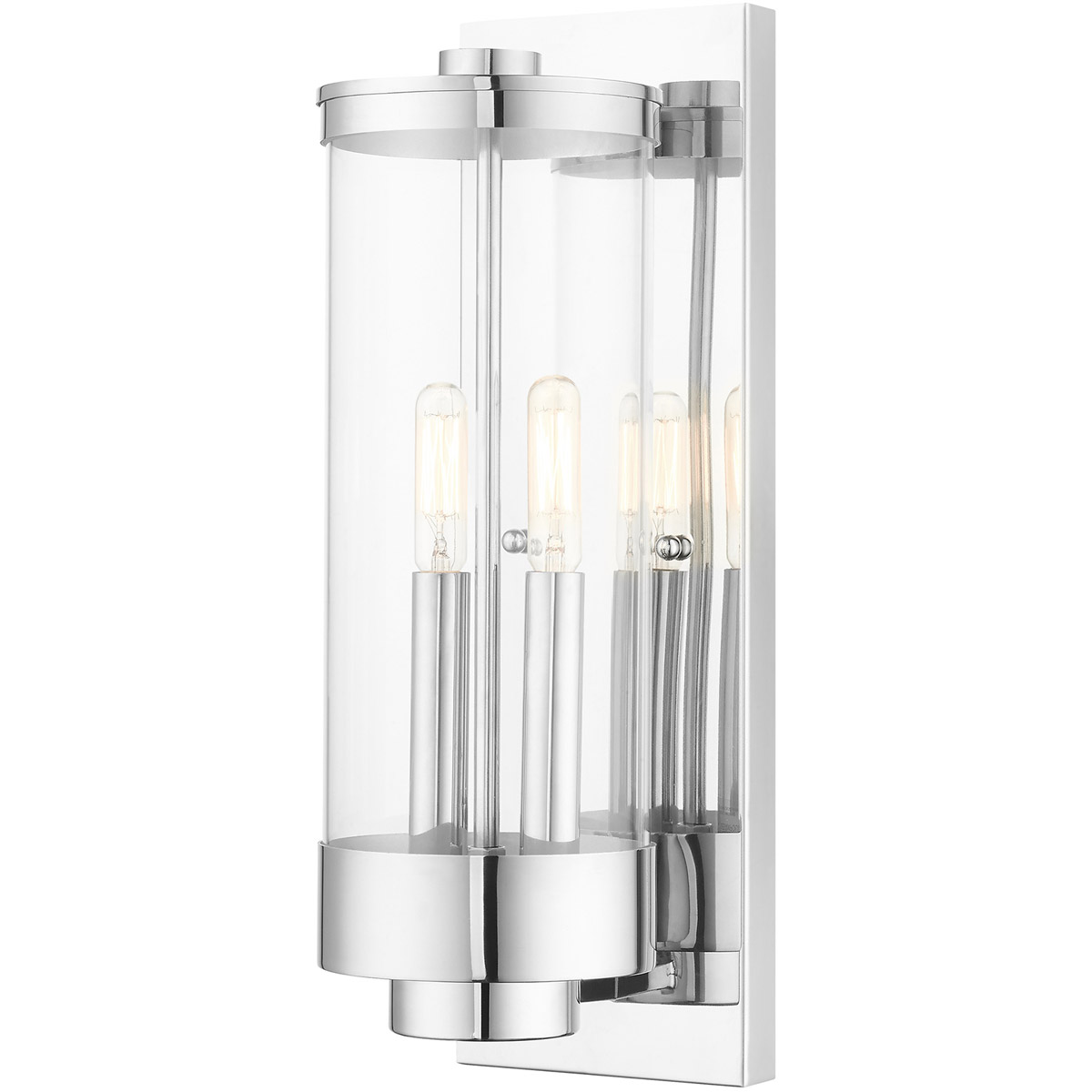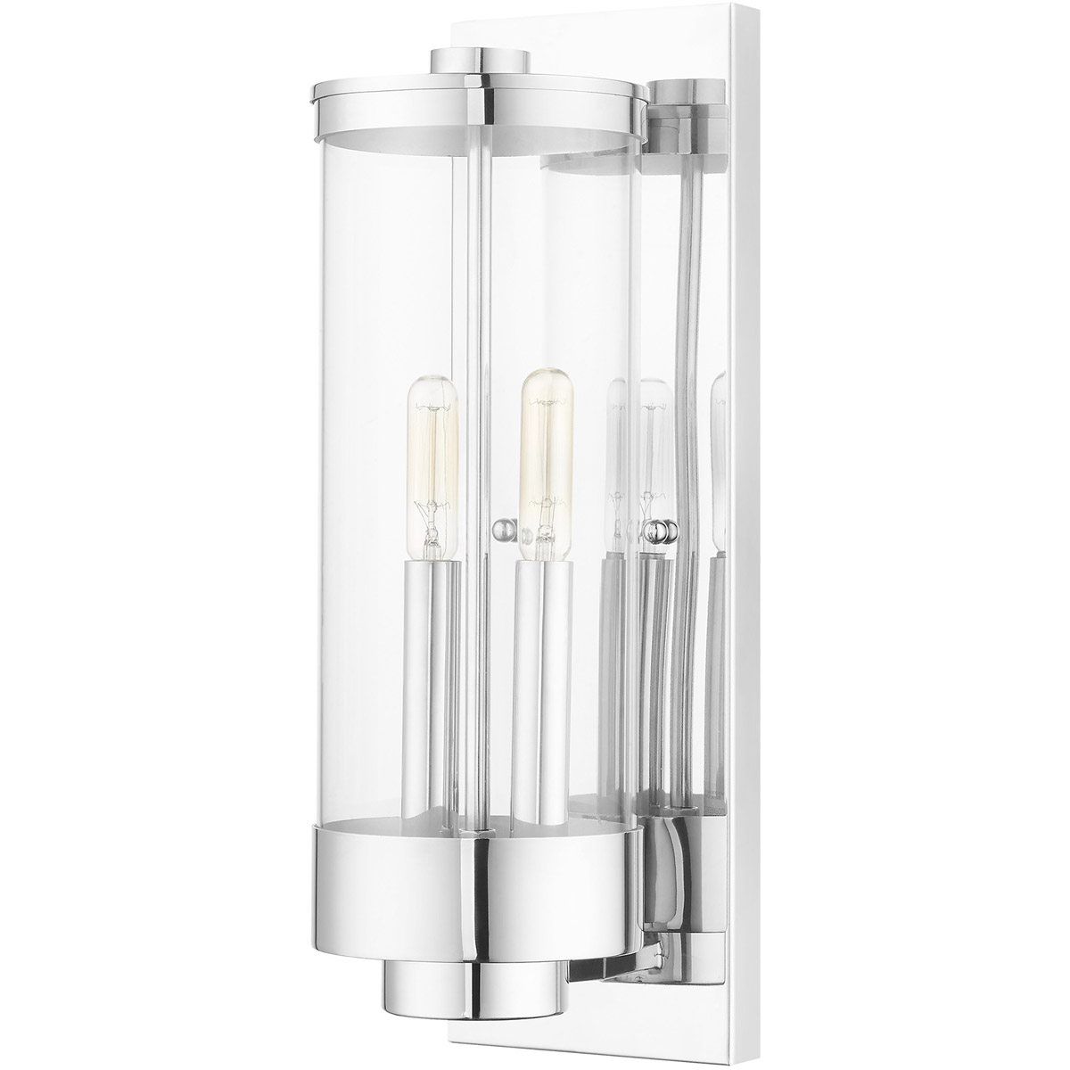 The two light outdoor wall lantern from the Hillcrest collection made of rugged stainless steel features a simple elegant polished chrome frame paired with closed top clear glass shade. The shade is accented with a banded polished chrome ring to carry through the theme of finely crafted metal fittings.