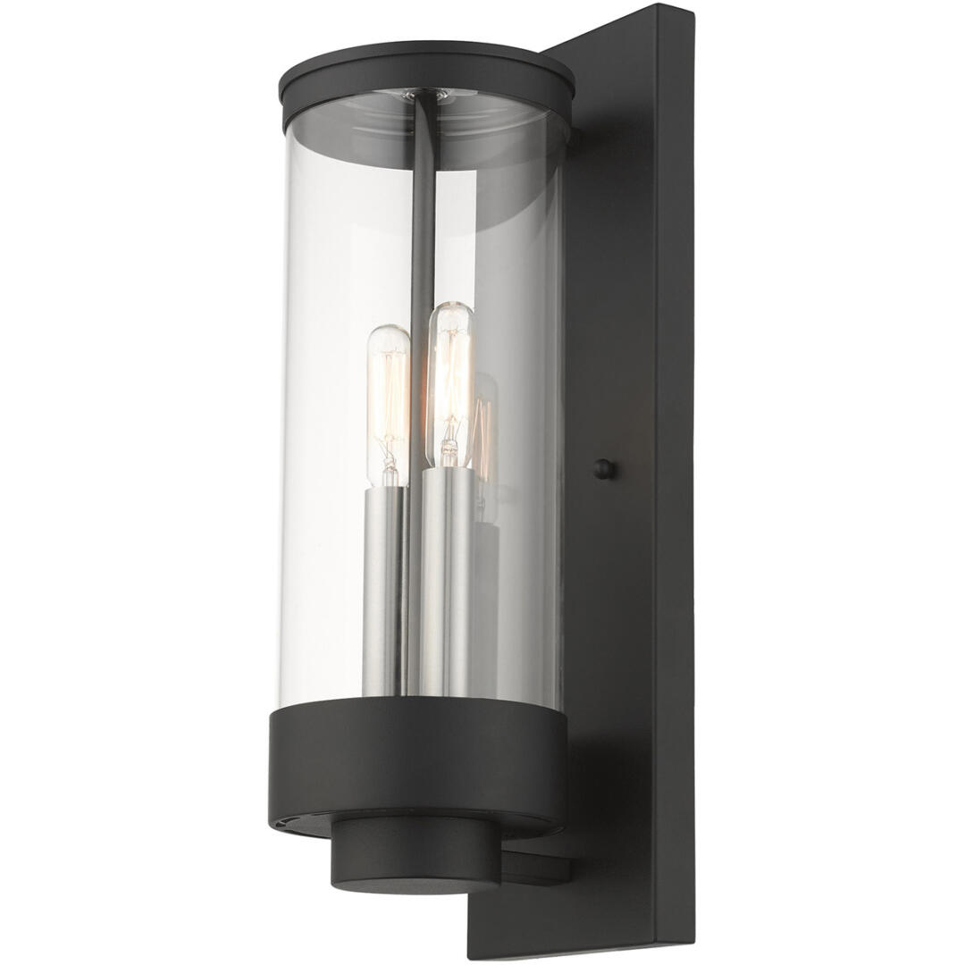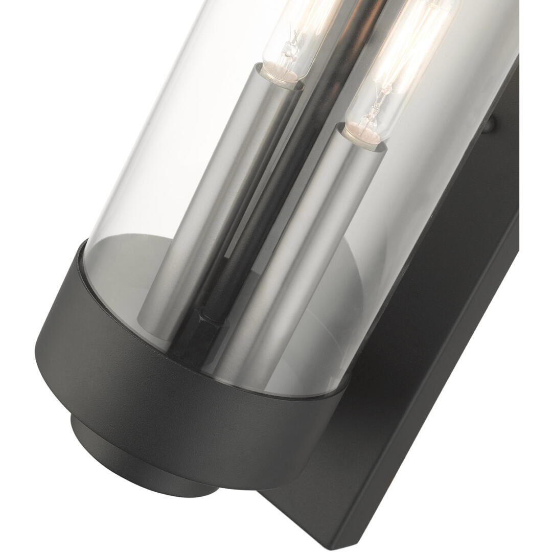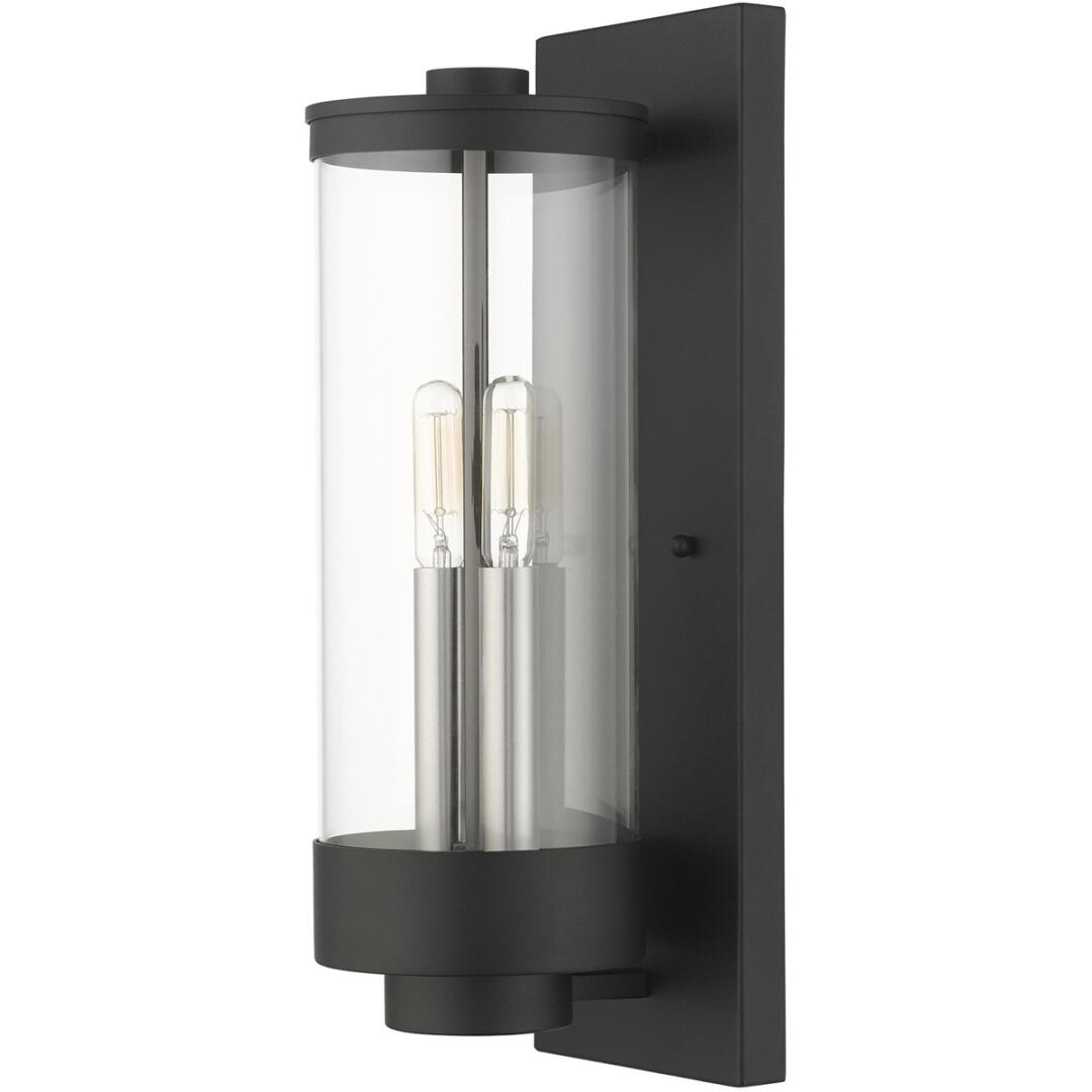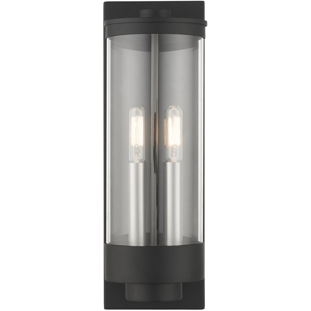 The medium two-light outdoor hand crafted wall lantern from the Hillcrest collection is made of rugged stainless-steel and features a simple yet elegant textured black finish frame paired with a closed top clear glass shade and is accented by brushed nickel candles. The glass shade is topped off with a textured black ring accent to carry through the theme of the finely crafted design. Use indoors or outdoors, this piece complements modern, nautical, contemporary or urban homes.